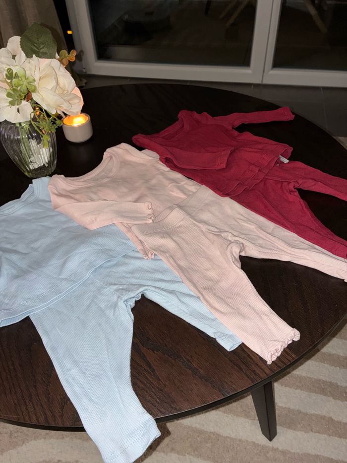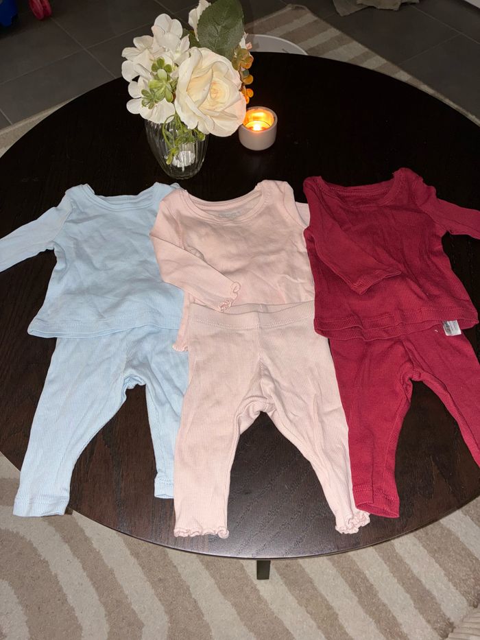 Je vend un lot de 3 ensemble legging + t-shirt manche longue en coton léger. Très bon état! Taille 0-3 mois voir plus car ils sont super extensibles.