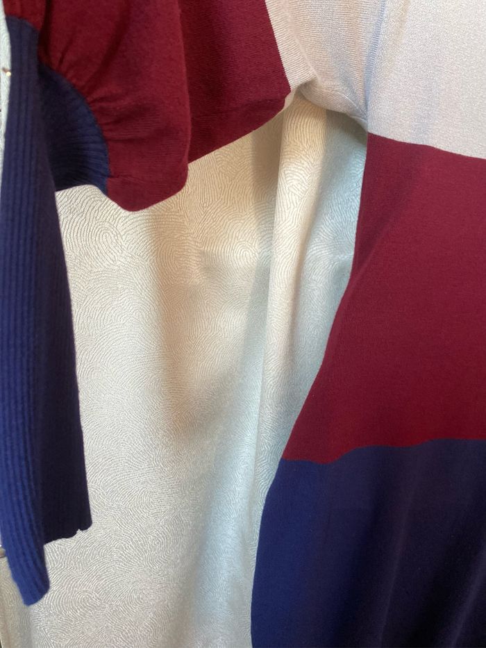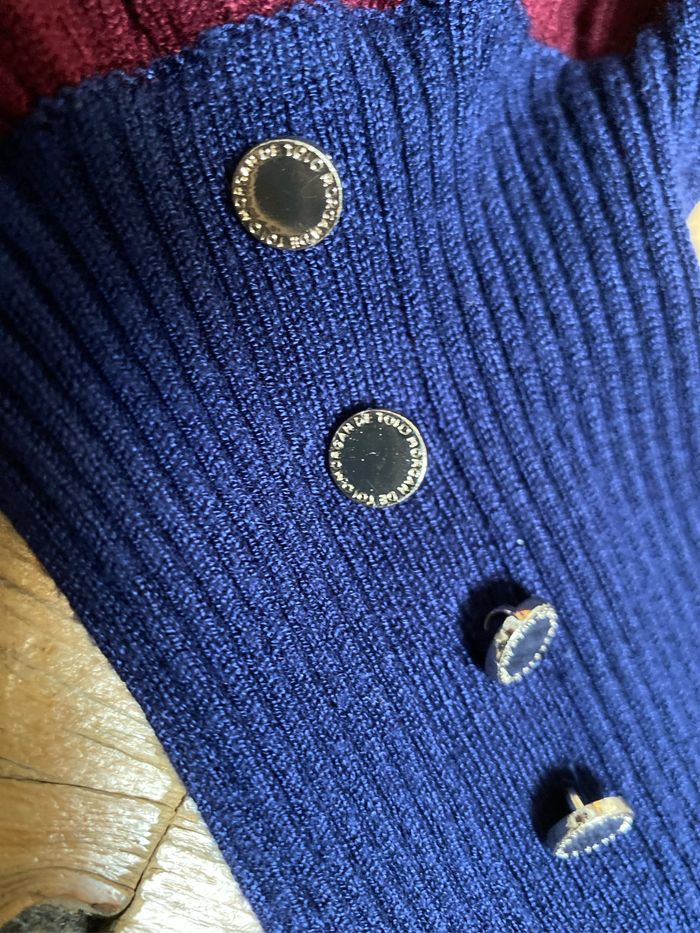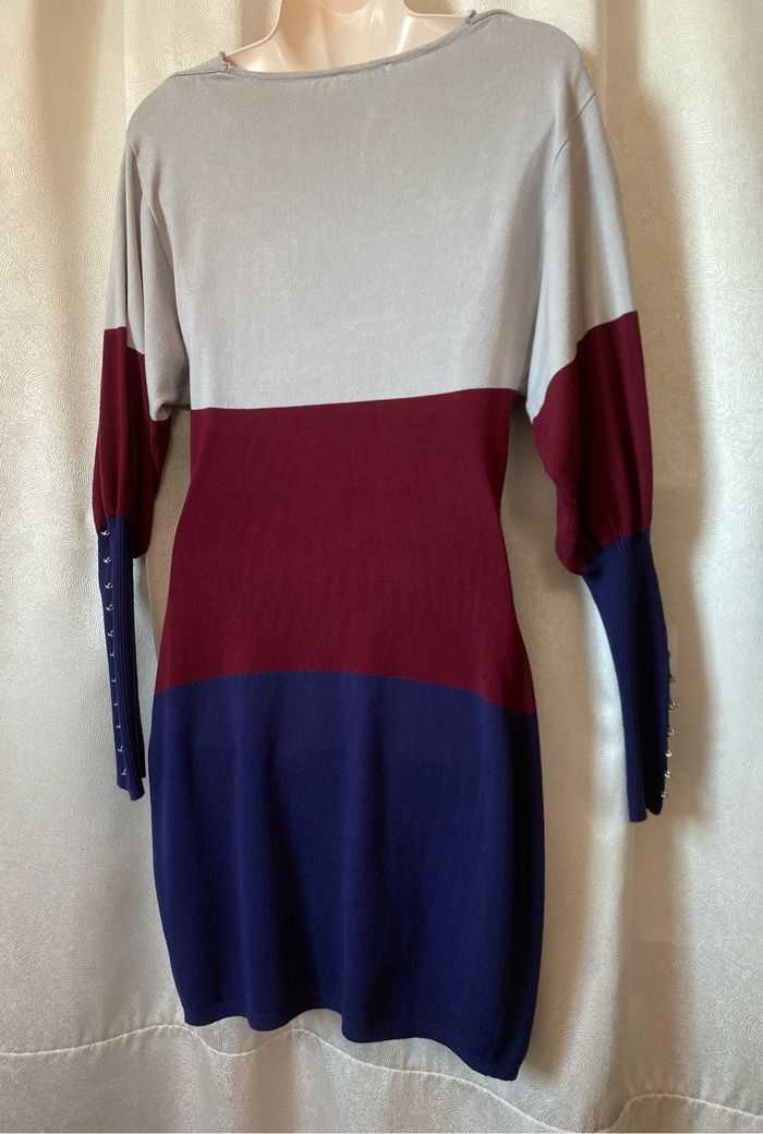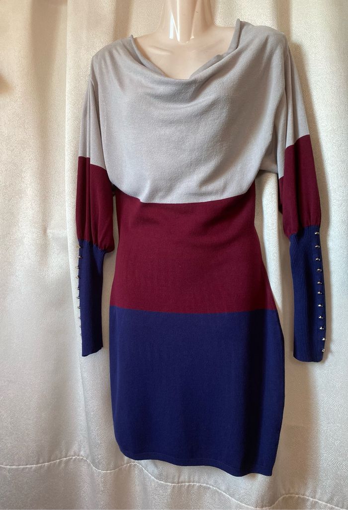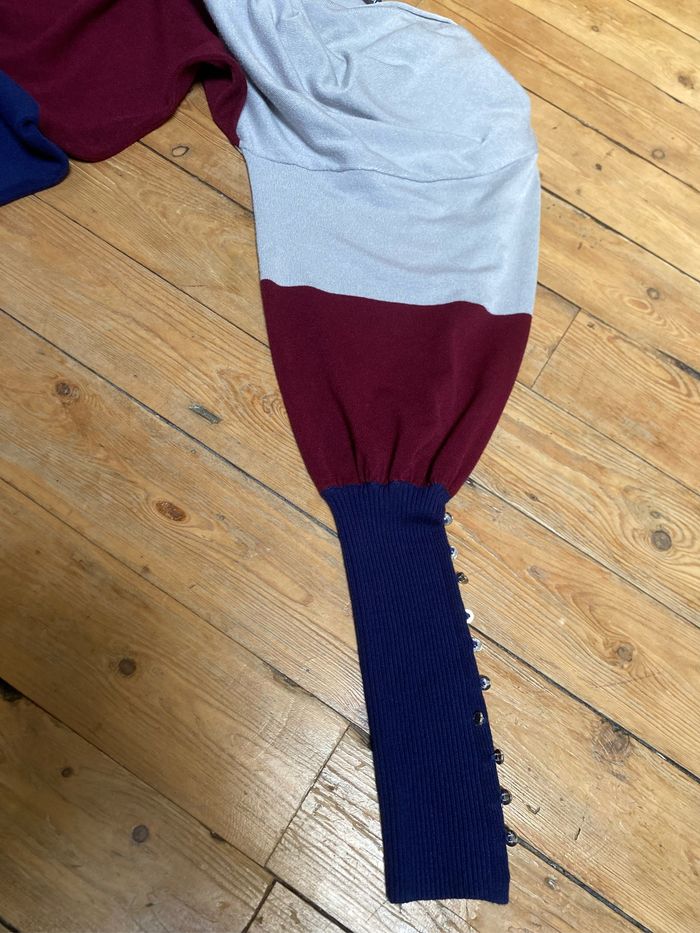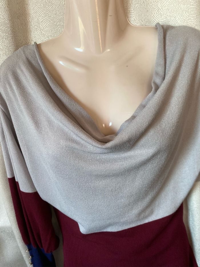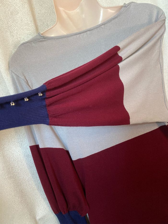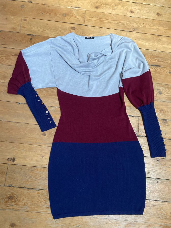 Super jolie petite robe tricolore bleu marine bordeaux gris perle Se porte presque du corps col bénitier Taille S Marque Morgan Défaut : manque le premier bouton aux poignets , je trouve que cela passe inaperçu