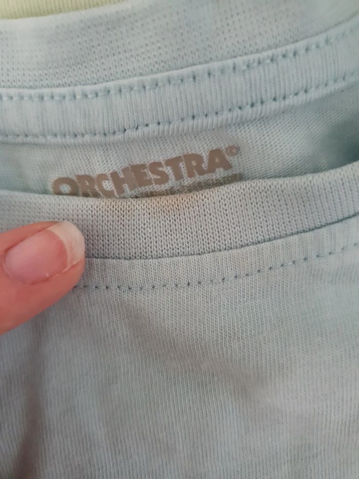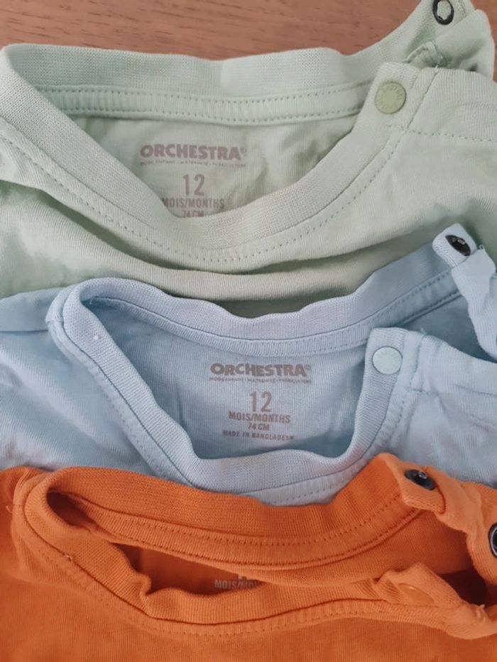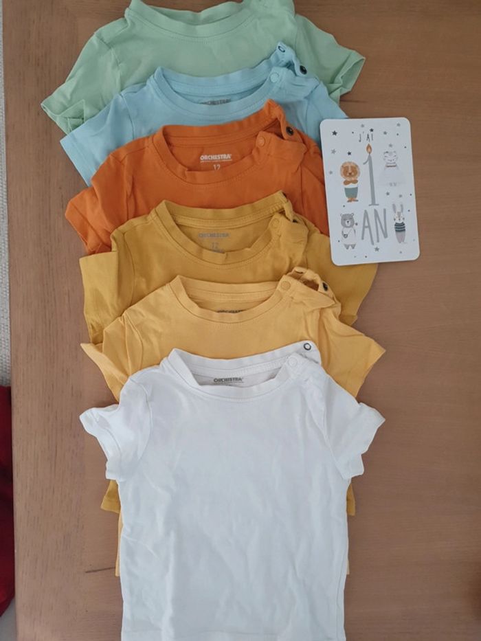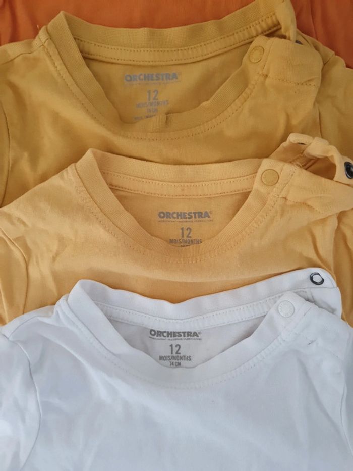 6 t-shirts 12 mois 74 cm Orchestra Col du t-shirt bleu tâché +Micro tâche sur un t-shirt jaune -> je les repasse en machine pour voir si elles partent Me contacter avant achat pour que je vous dise si c'est parti. Sinon j'adapterai le tarif. @coralielssr_garçon_12mois