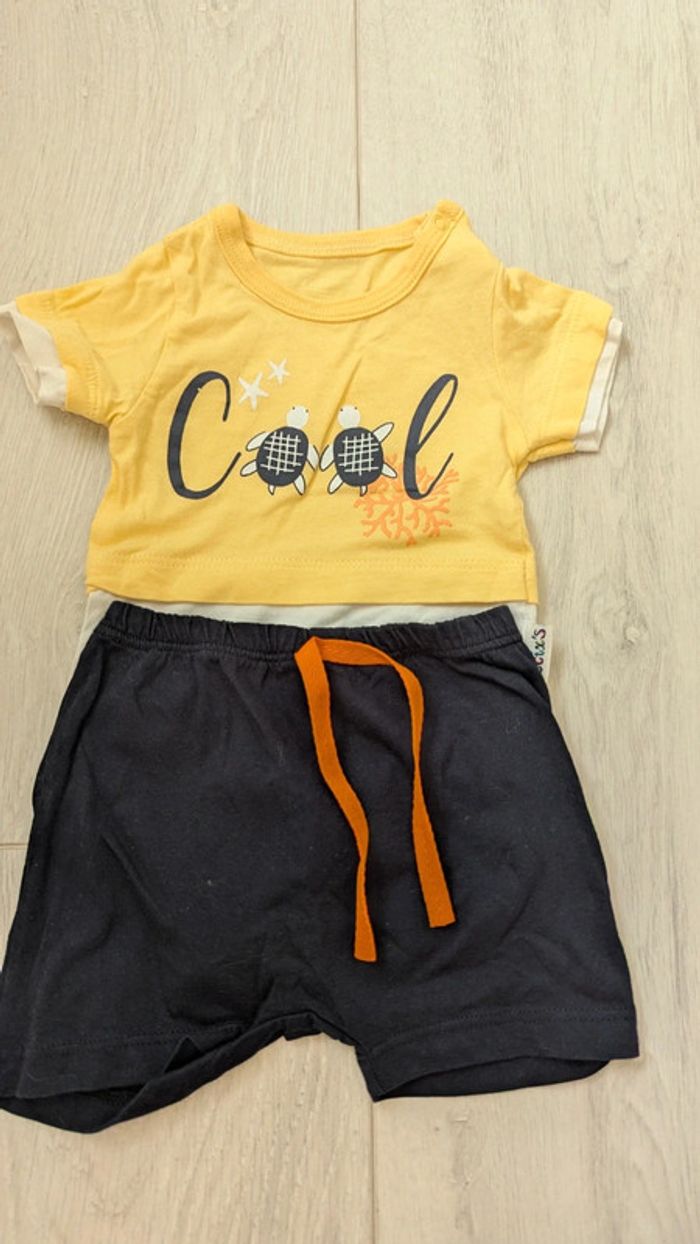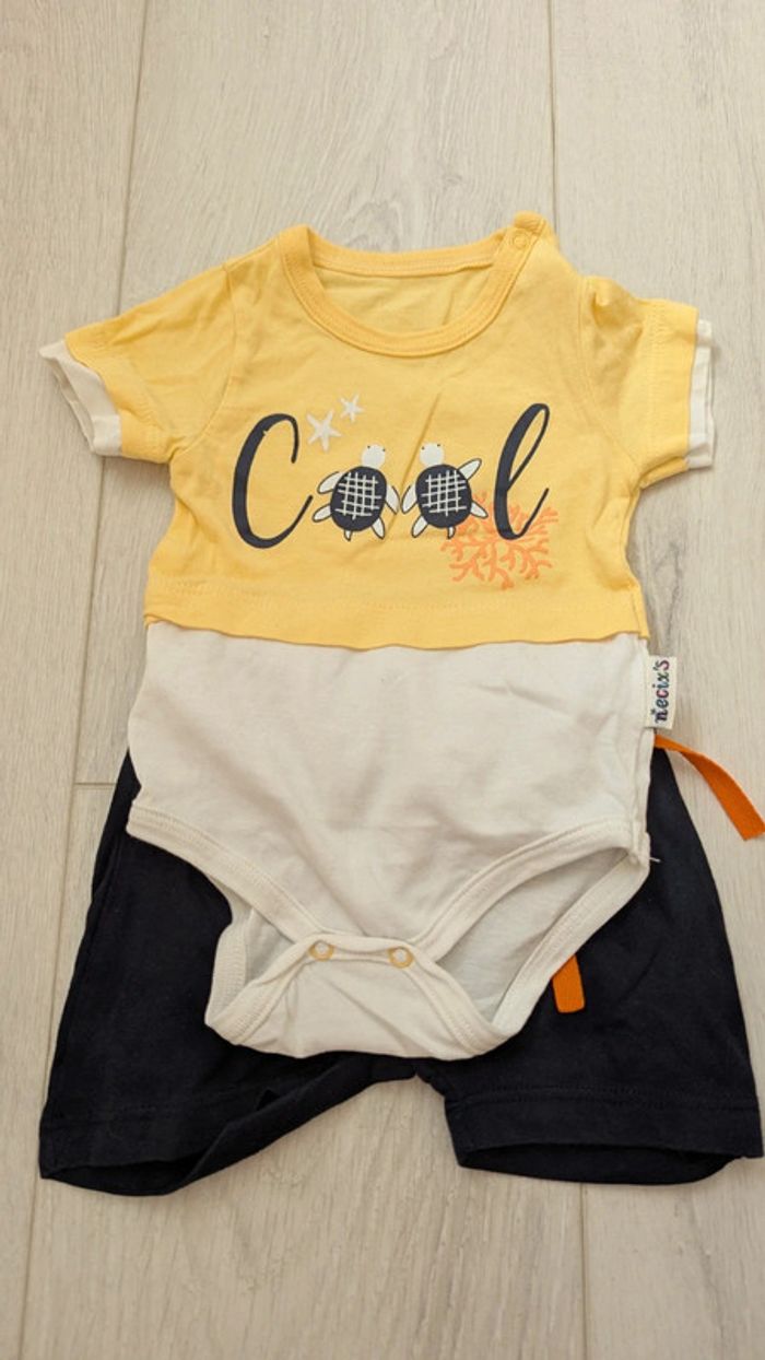 Ensemble d'un body façon tee-shirt et d'un short. Très bon état, taille 0-3 mois
