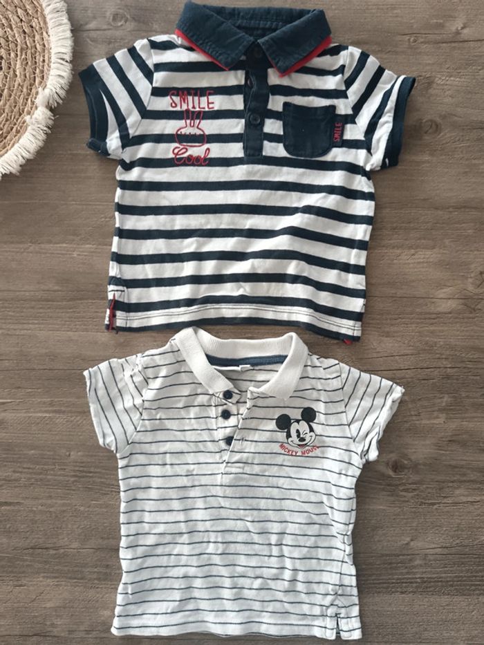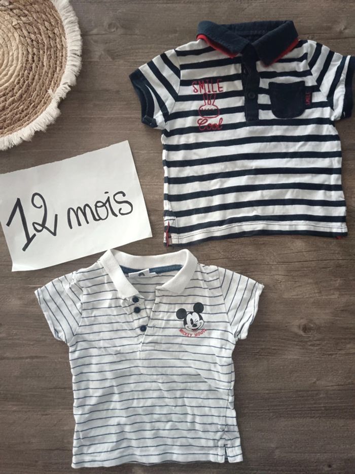 Lot de 2 t-shirts 1 Bleu marine rayé blanc et rouge Inscription smile Cool avec col avec boutons Marque Kiabi 1 blanc rayé bleu Motif Mickey Col avec boutons Marque Disney Baby Taille 12 mois Très bon état général pas de trou ni de tâches 📌#angeelle42_Garçon_12mois