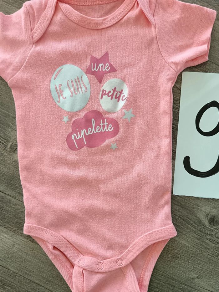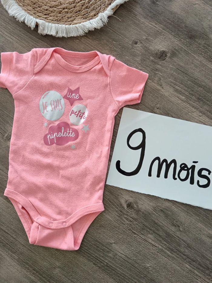 Bodie rose avec motif et inscription je suis une petite pipelette Taille 9 mois Marque Gémo baby Très bon état général pas de tâches ni de trou tel quelques légère Bouloches