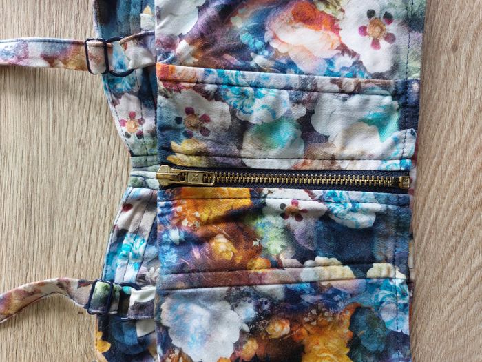Top bustier crop à bretelles de la marque Topshop Petite. Bon état. Taille 32. Coloris = multicolore motif fleurs. Bretelles réglables. Fermeture par zip dans le dos. Composition = 98% coton, 2% élasthanne. Fabriqué au Maroc. Mesures à plat = Largeur = 30cm environ. Longueur (sans les bretelles) = 18cm environ. N'hésitez pas à me contacter si vous avez des questions. Je vous répondrai dès que possible.