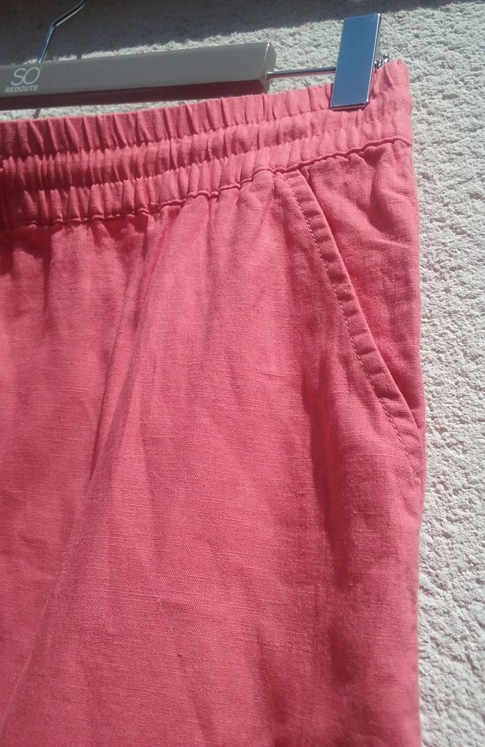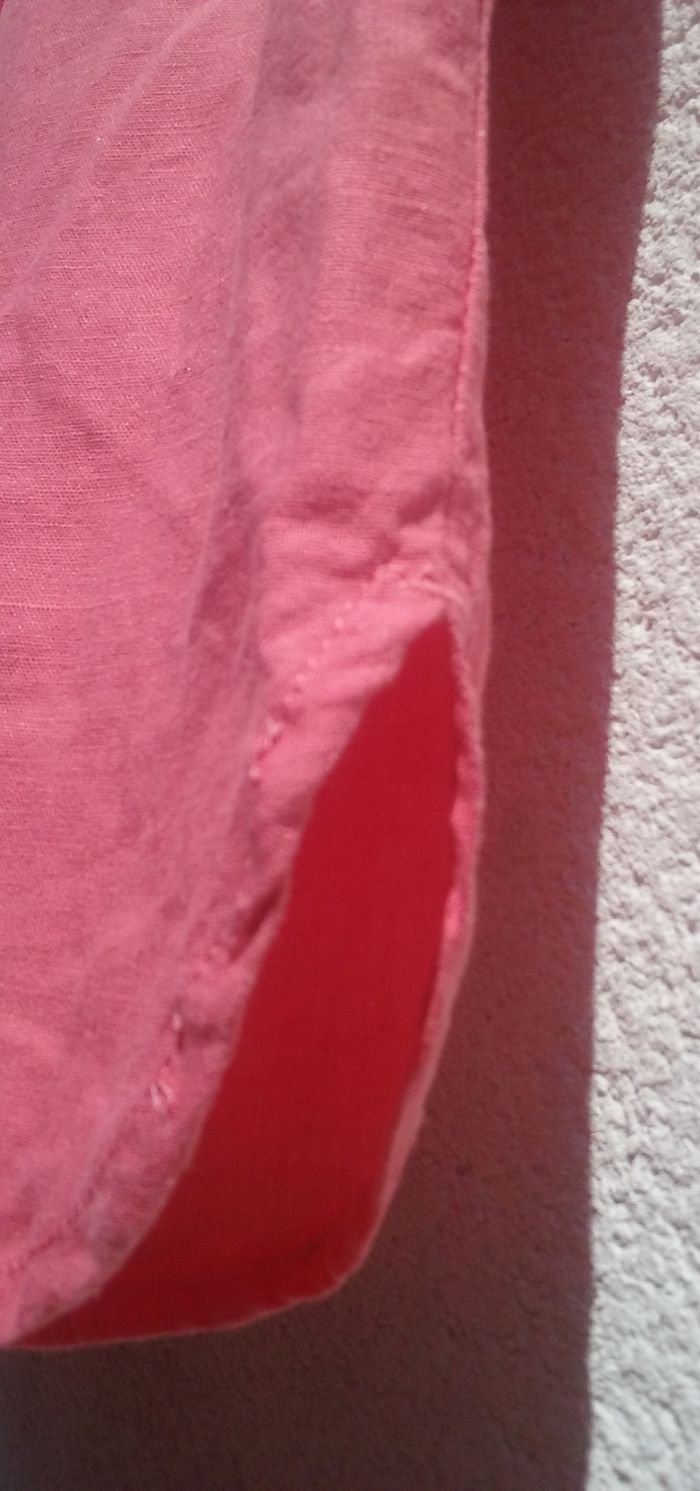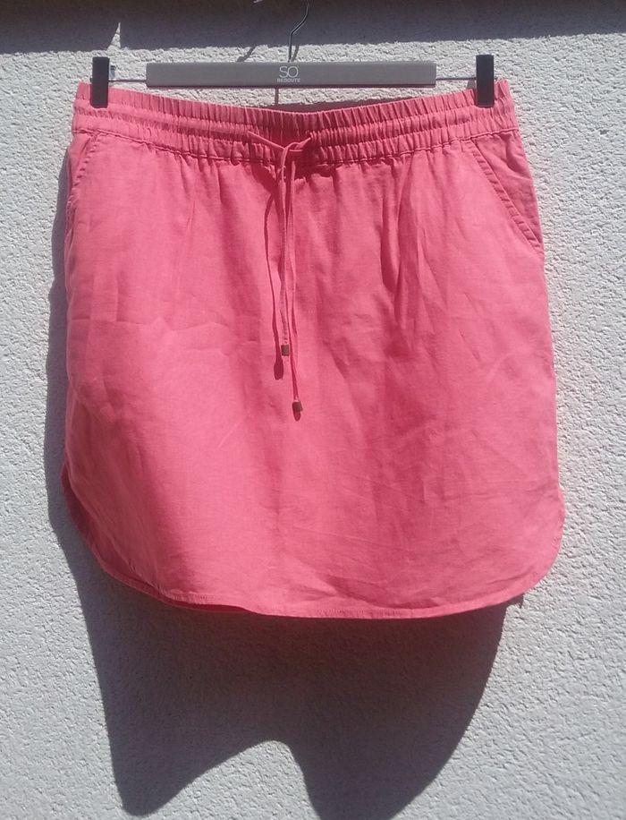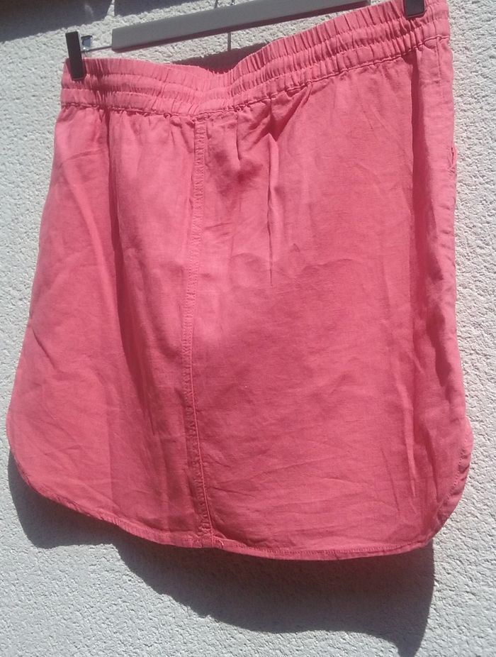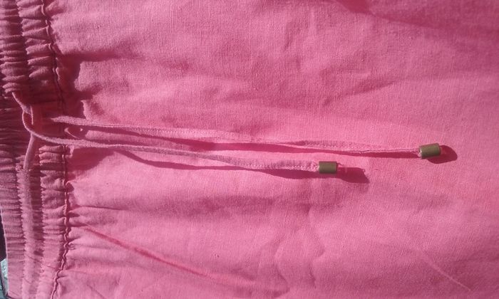 Ceinture élastiquée avec cordelette de serrage, 2 poches, petites fentes sur les côtés bas de la jupe, coloris rose plus soutenu que sur les photos, attention petit trait noir au dos (cf dernière photo).