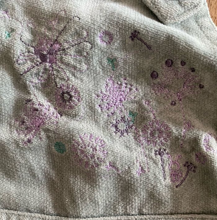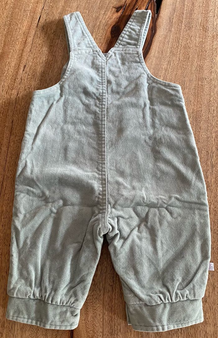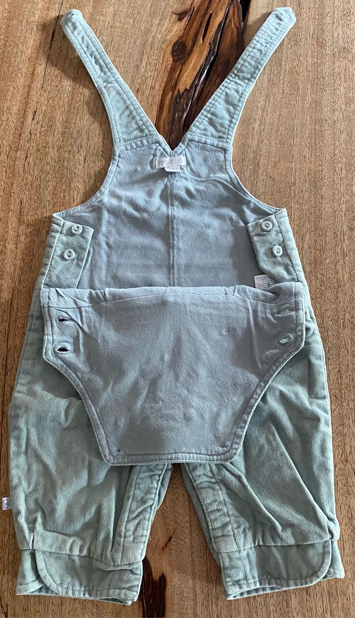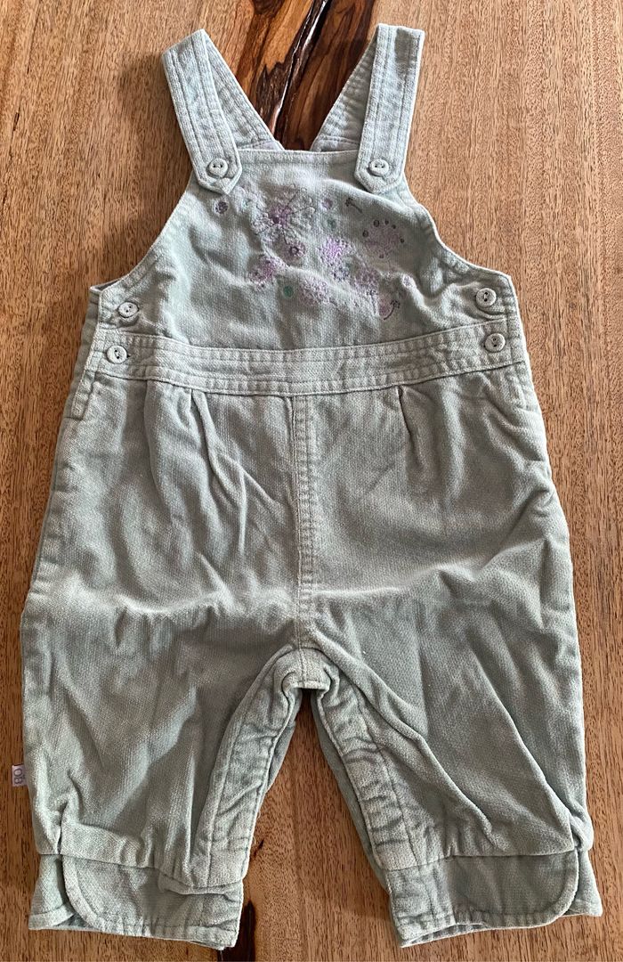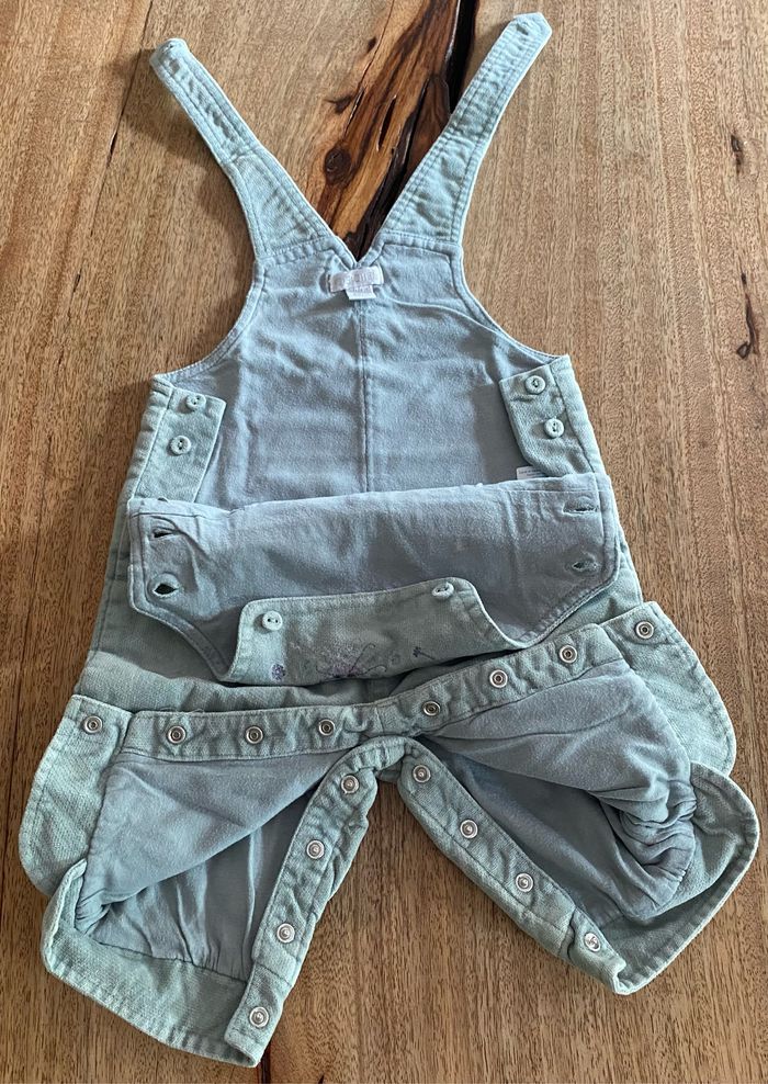 Salopette, de couleur vert menthe. Petit dessin de fleurs en broderie en haut de la salopette. 2 boutons de chaque côté pour l’ouverture du haut de la salopette, 1 boutons à chaque bretelles. Ouverture du pantalon au niveau des jambes avec 8 petits pressions. 100 % coton. Sans taches