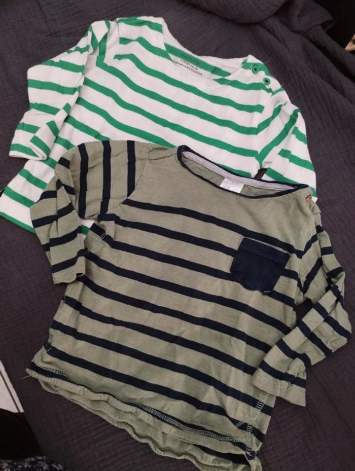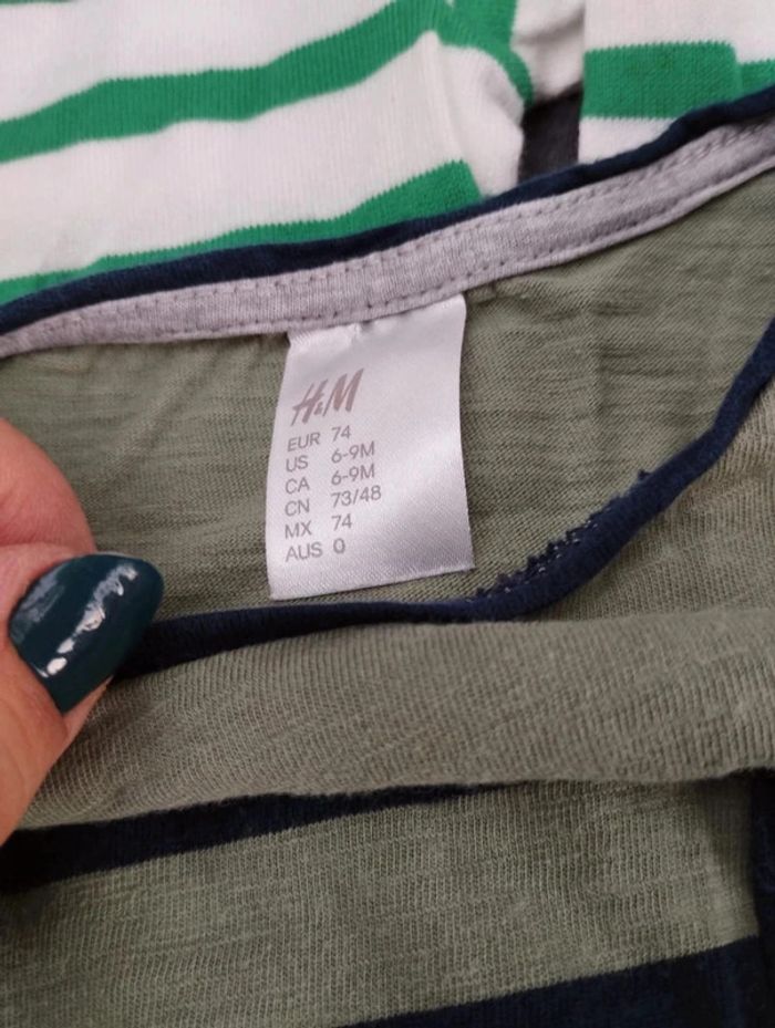 Lot de deux tee-shirts marinière 6 mois Un bout'chou vert et blanc et un h et M kaki et marine En TBE #dinooblogarcon #dinoobloboutchou