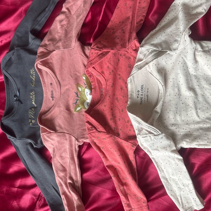 Lot de 4 bodies dont 3 en très bon état 2 Gemo + 2 Tape à l’œil 6 mois • manches longues