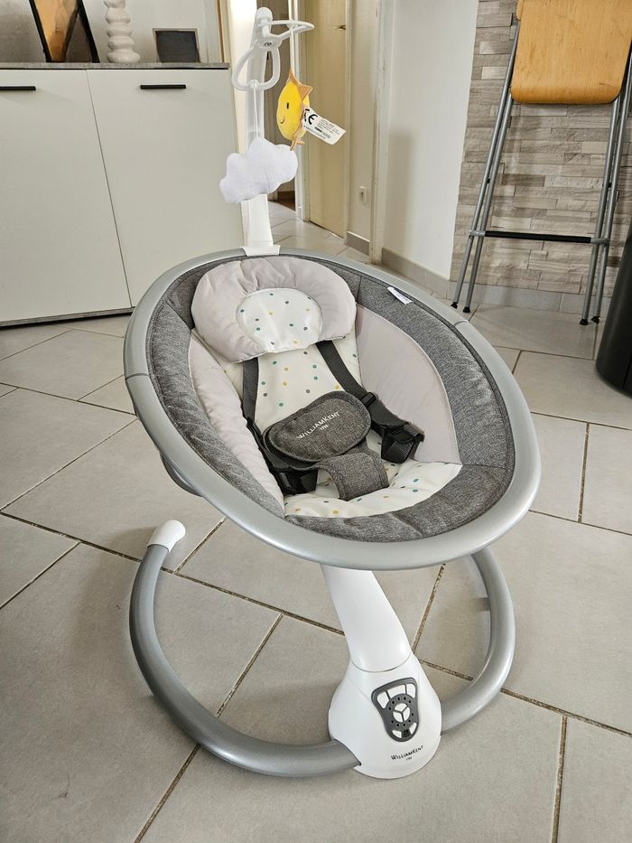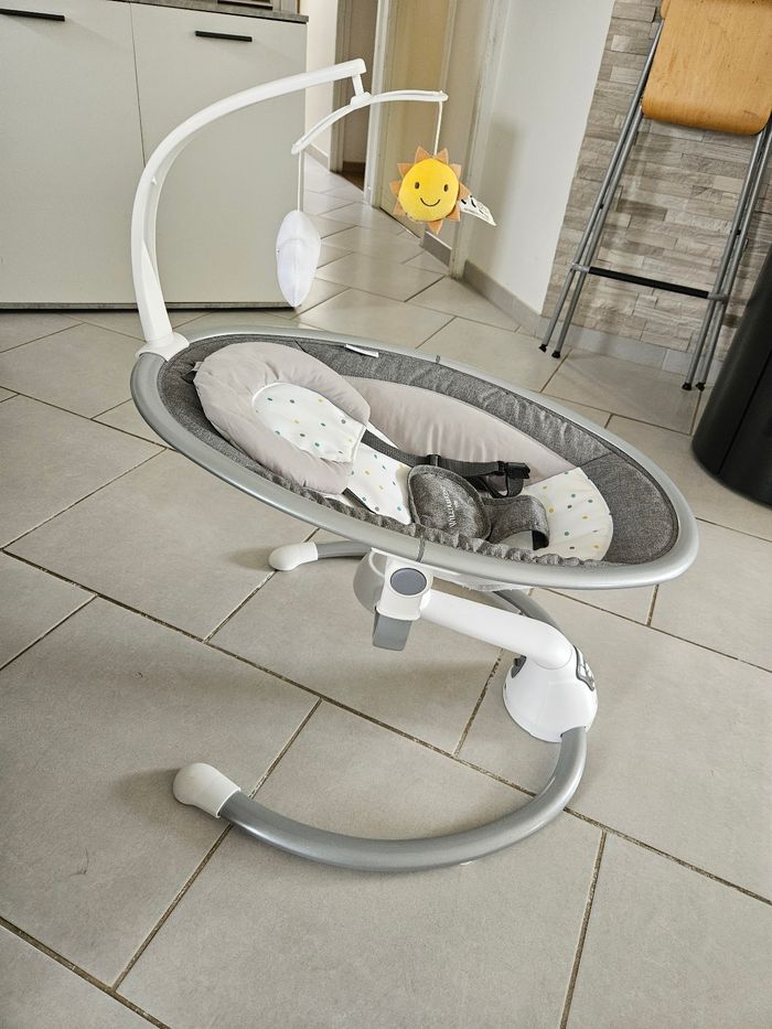Assise inclinable et orientable, blocage du balancement Balancement orientable Arche de jeu amovible Coussin de maintien amovible Minuterie programmable 15 / 30 / 60 minutes 12 mélodies ou sons de la nature Volume ajustable  5 vitesses de balancement  Déclanchement automatique si bébé pleure / gigote Alimentation sur secteur (adaptateur fourni) ou avec 4 piles LR6 non incluses Harnais 5 points Coloris doux et mixte  Caractéristiques : Utilisation : de la naissance à 9 kg Type de balancement : pendulaire Dimensions : 63 x 68 x 58 cm Très bon état. Neuf 150€ vendu 70€