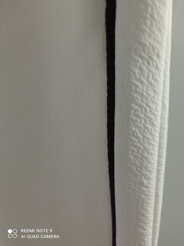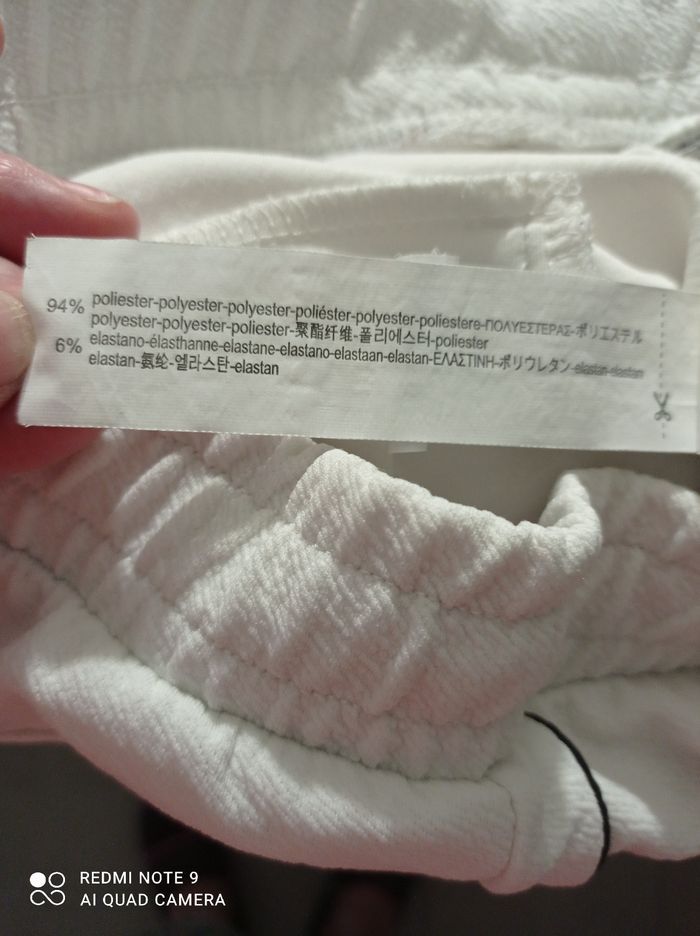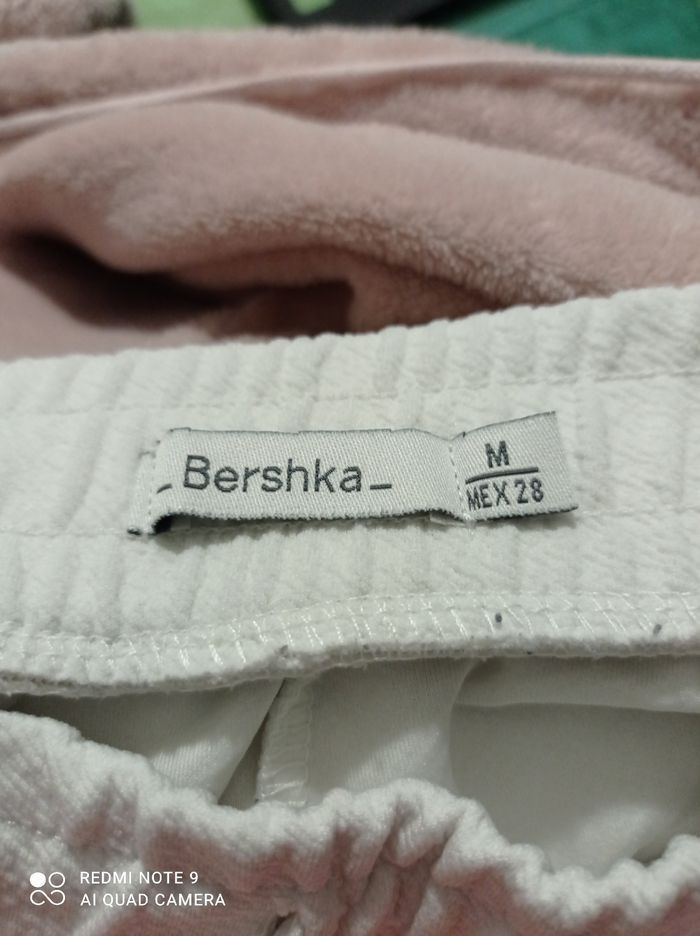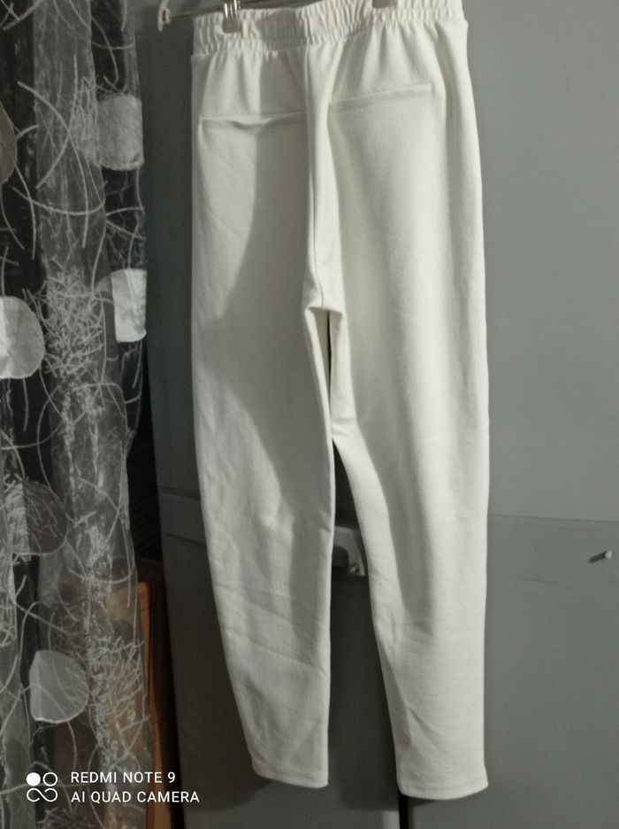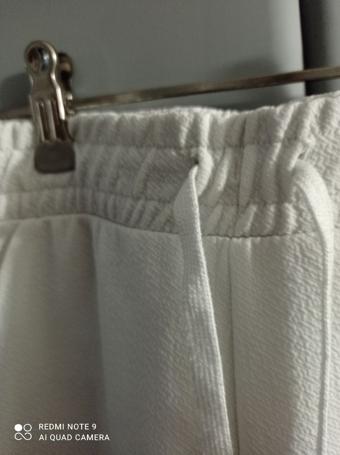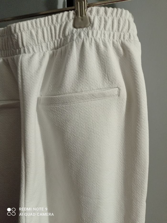 Pantalon Femme Bershka - Taille M - Couleur Blanc Cassé - En Polyester 94 % et Elasthanne 6 % - Tissu Très Légèrement Gauffré qui Donne un Côté Chic - Ceinture Élastique avec Lien - Liseré Noir le Long Côté des Jambes - Longueur 87 cm - Tour de Taille 66 cm sans Tirer sur la Ceinture Élastique - Bas Patte 12,5 cm - Neuf.