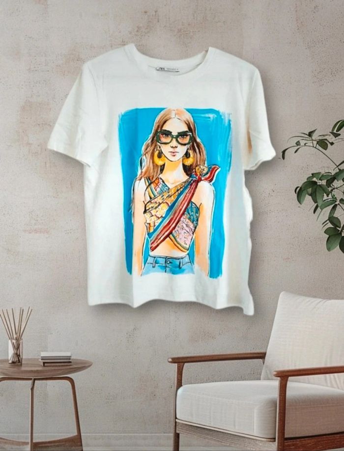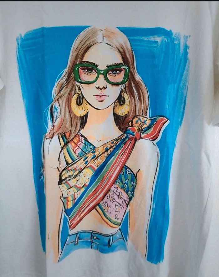 Magnifique t-shirt Zara S Blanc avec motifs sur le devant Tendance Ravissant 😍 #tshirt #tshirtzara #zara #zara36 #femme36 #tshirtvisage #tshirtblanc #tshirtzara36