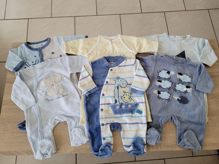 Vend lot de 6 pyjamas dont un sans pieds garçon taille 1 mois en bon état juste des tâches sur un et un petit trou sur un autre (voir photos).