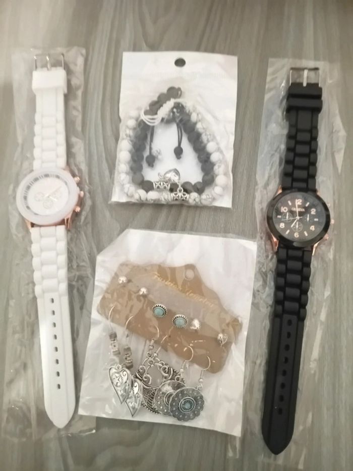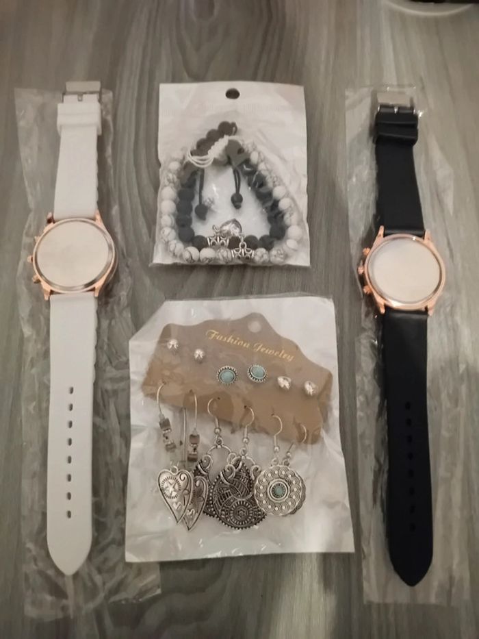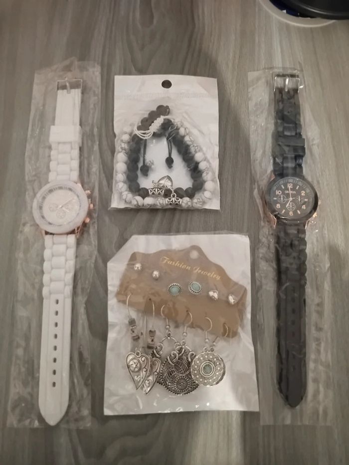 Lot de bijoux fantaisies neufs ( femme ) Le lot comprend ce qu'il y a en photos 2 montres neuves avec piles inclus ( 1 blanche ,1 noire) 2 bracelets cœur aimanté neufs ( 1 blanc, 1 noir) 1 lot de 6 paires de boucles d'oreilles neuves Envois mondial relais 7j/7j