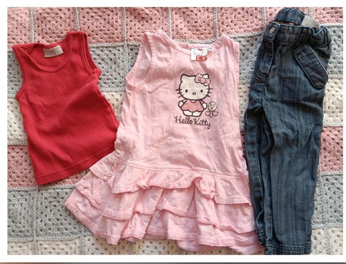 Lot vêtements taille 18 mois: une robe hello kitty (dessin un peu abîmé) Un débardeur Un jean Le tout en bon état #18moismarj901