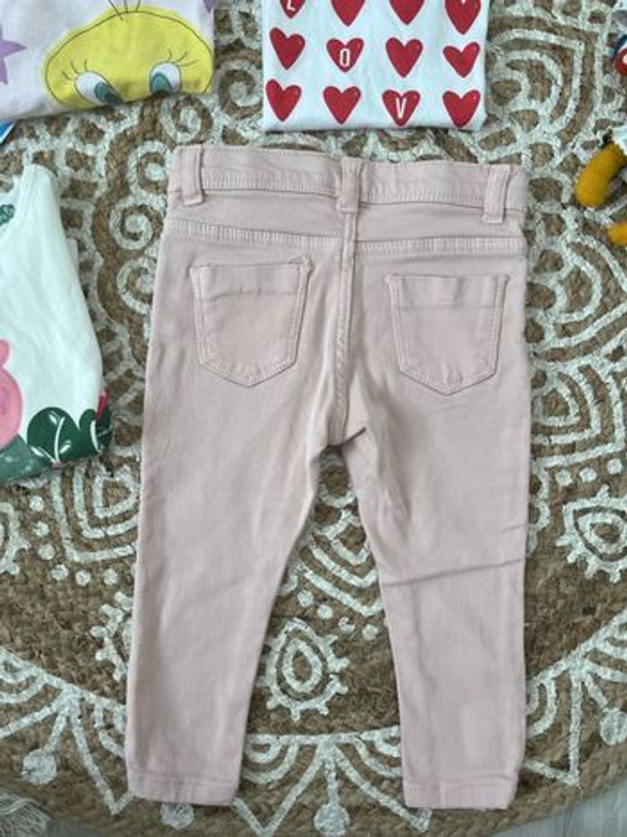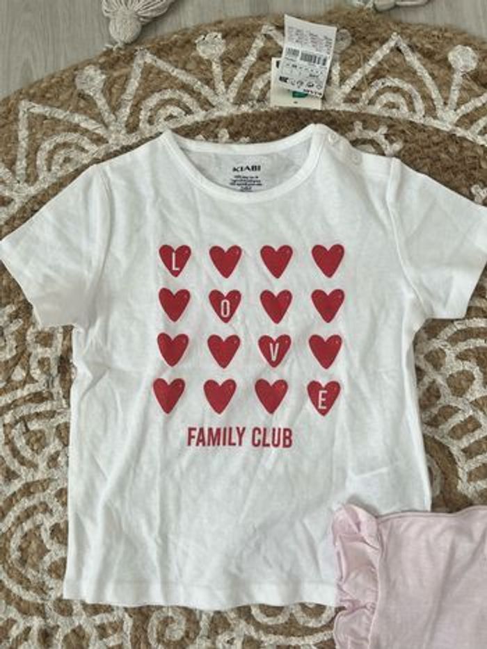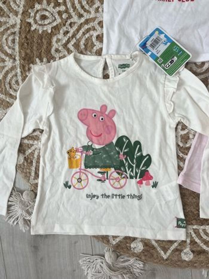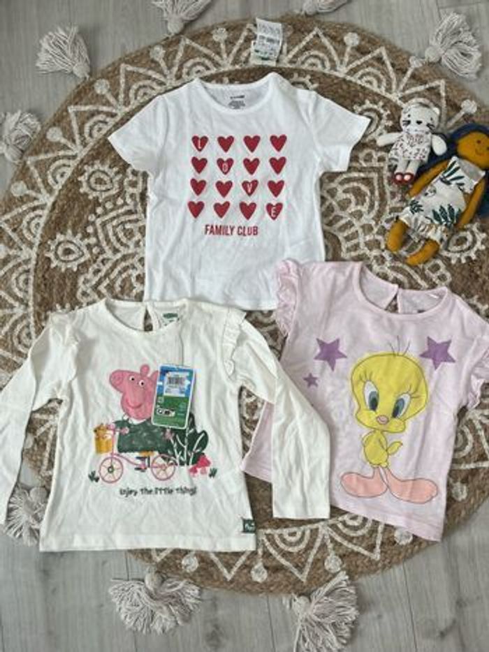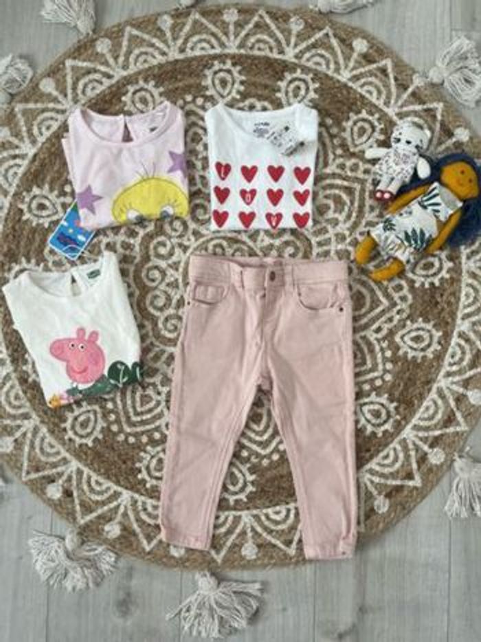 Bonjour. Sublime lot de 2 t-shirt manches courtes : - un Kiabi neuf avec étiquette - un orchestra mis une fois 1 t-shirt neuf avec étiquette peppa pig Un jean Zara rose très peu mis en excellent état Taille 86 cmt