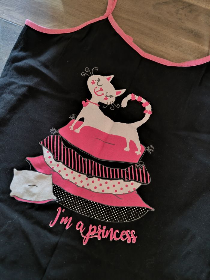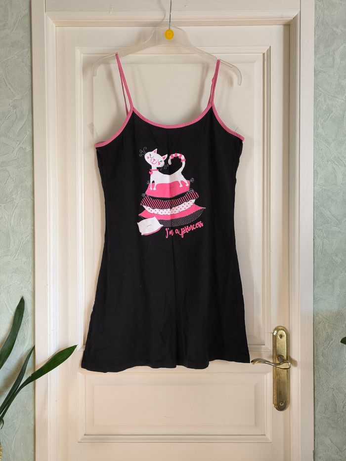 Nuisette/Chemise de nuit à bretelles Marque Influx Taille 42-44 • Coloris noir, rose, blanc • Imprimé chat, inscription "I'm a princess" • Bretelles réglables • Stretch, coton fin Largeur aisselle à aisselle non étirée : 46 cm Largeur aisselle à aisselle étirée au maximum : 63 cm Longueur totale : 89 cm Longueur aisselle : 67 cm En très bon état #evelyne_taille_42 #evelyne_taille_44