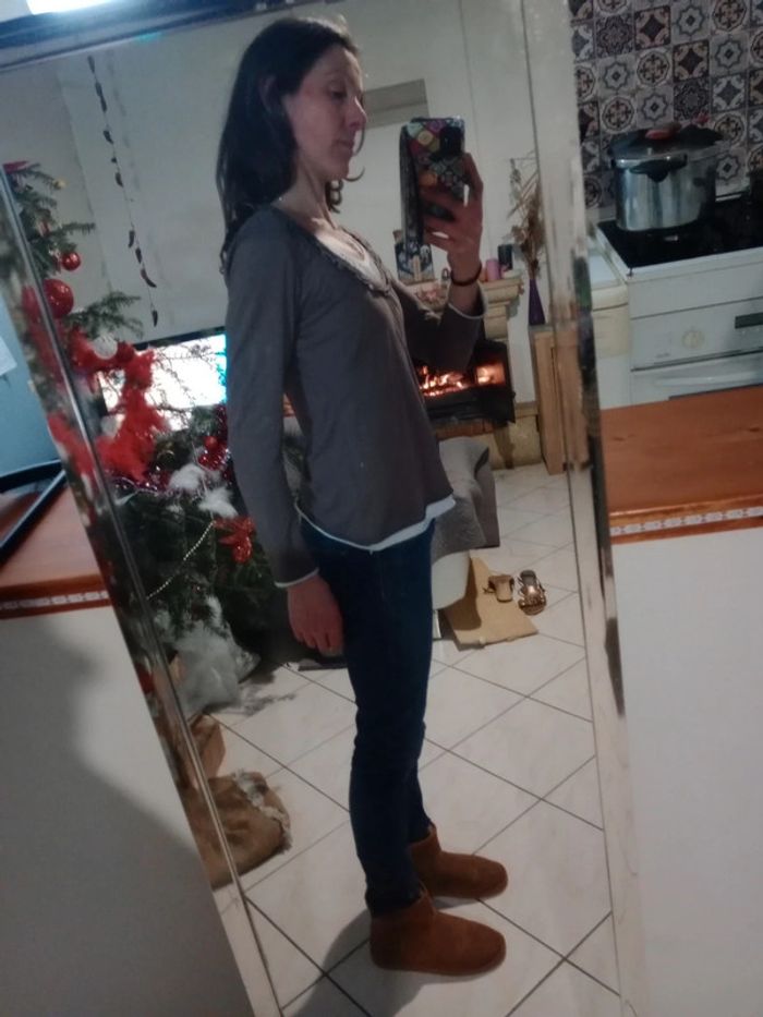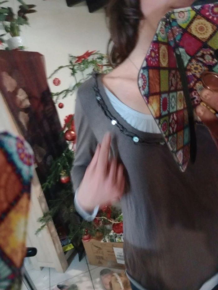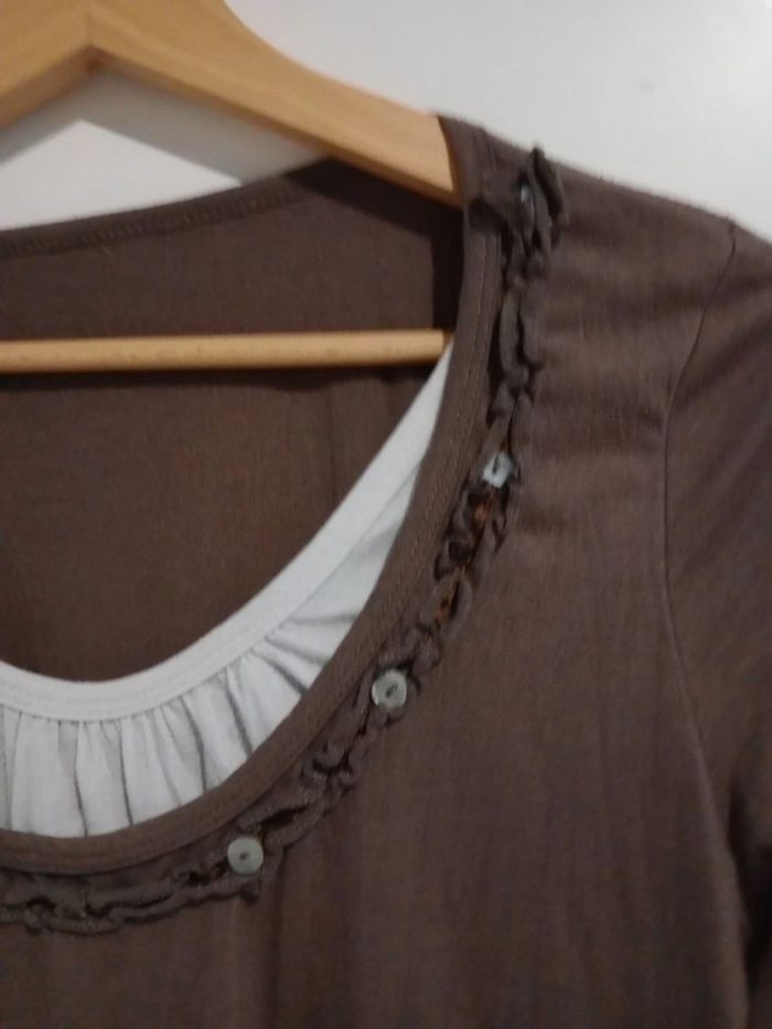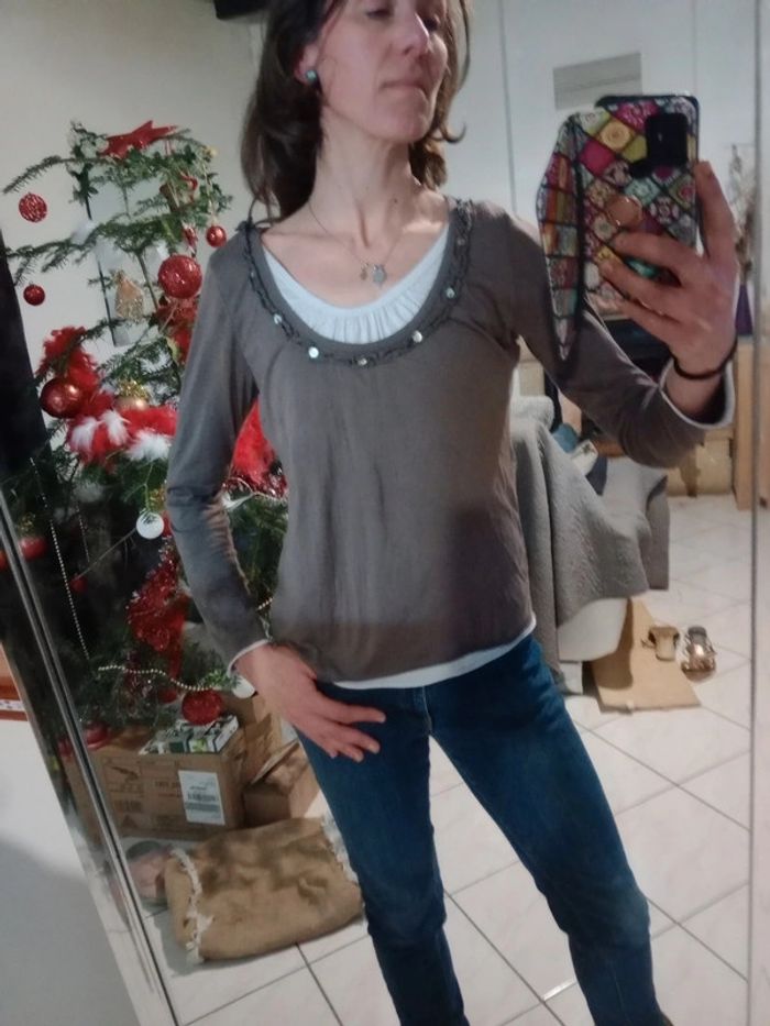 Col rond laissant apparaitre la 2 e partie de ce haut combiné Le tissu a subi plusieurs lavages donc je l indique dans la catégorie satisfaisante Indiqué taille unique c'est une taille s 65 % coton 30 % polyester 5 % élasthanne Aisselle à aisselle 48 cm #carineleray_femme_36