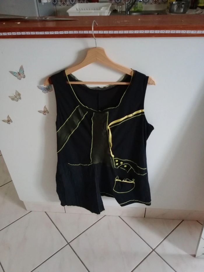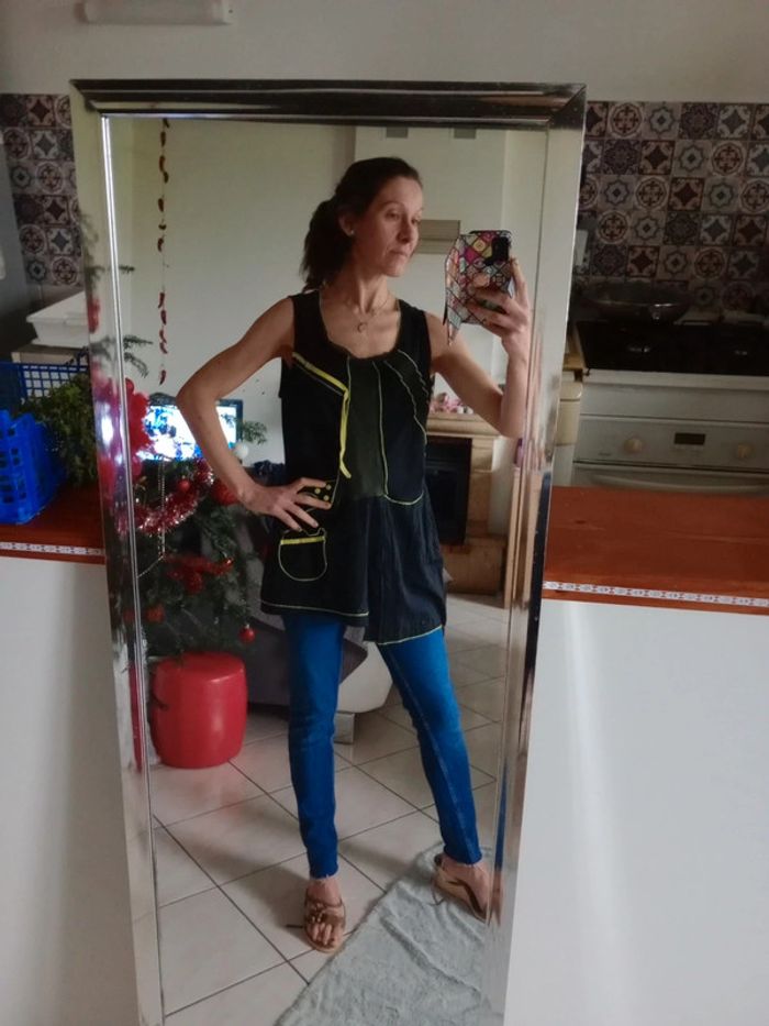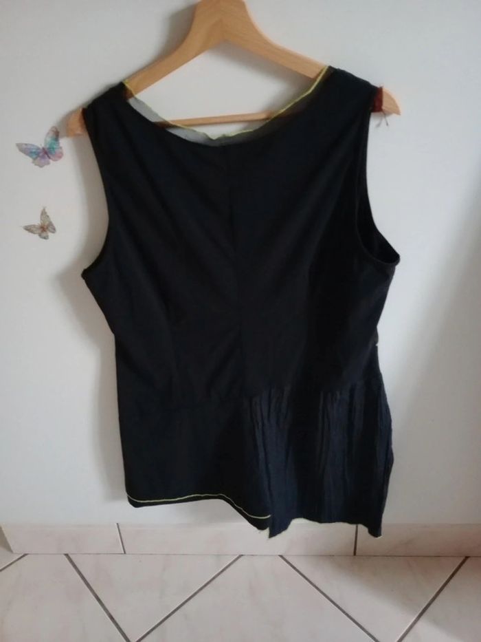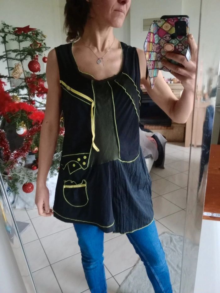 Quasiment neuve, très bien entretenue 😘 tunique sans manches avec de jolis détails esthétiques une petite poche en bas à gauche Les coutures sont vert jaune Présence d'empiècements tulle Asymétrique dans le bas Aisselle à aisselle 53 cm #carineleray_femme_46