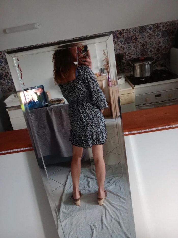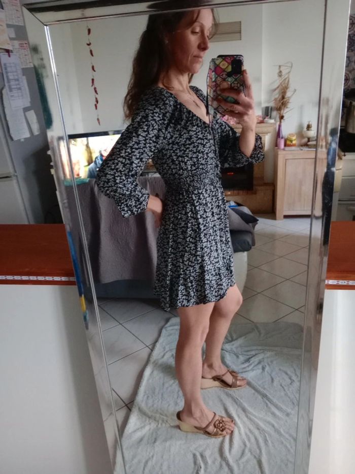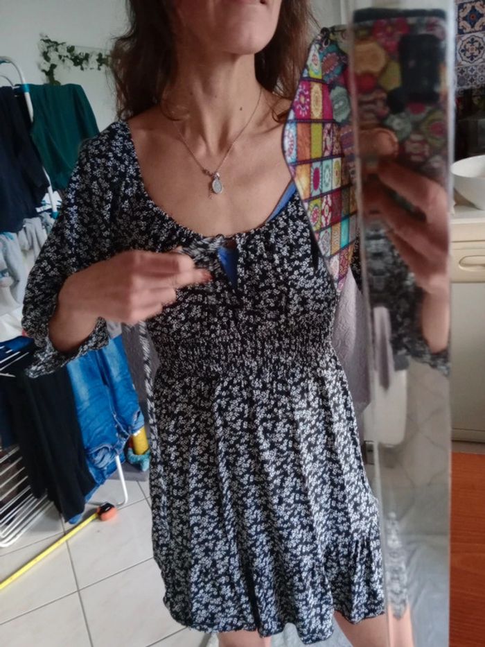 Superbe pièce 🥰 impeccablement entretenue, fluide et confortable Un bandeau élastique au niveau du buste ce qui permet de faire une jolie silhouette😘 Un ruban à l'entrepoitrine avec un espace Les manches s'évasent dans le bout Longueur 78 cm Aisselle à aisselle 43 cm #carineleray_femme_34