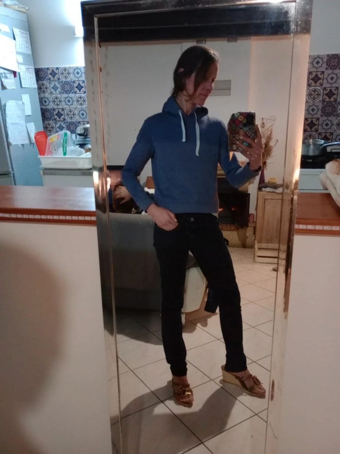 Pull a capuche avec poche centrale 2 liens pour resserrer la capuche La couleur est indiquée sur l étiquette bleu indigo... Pour moi, ce n est pas indigo mais plutôt bleu violet gris 😅 Épaule à épaule 41 cm Longueur 51 cm Aisselle à aisselle 47 cm #carineleray_femme_36