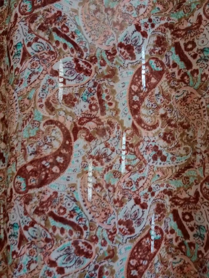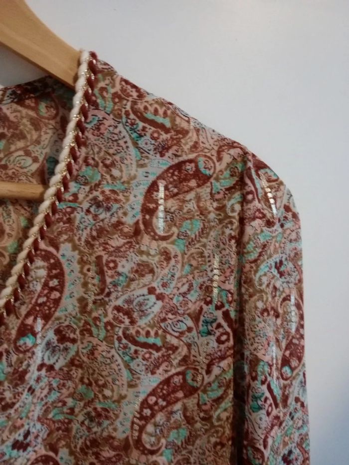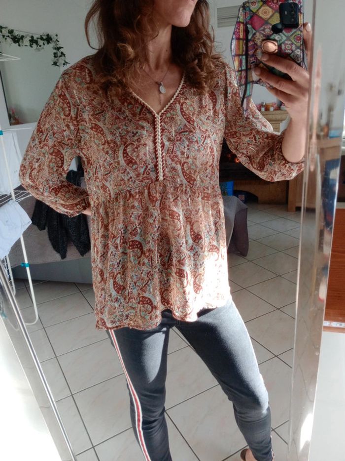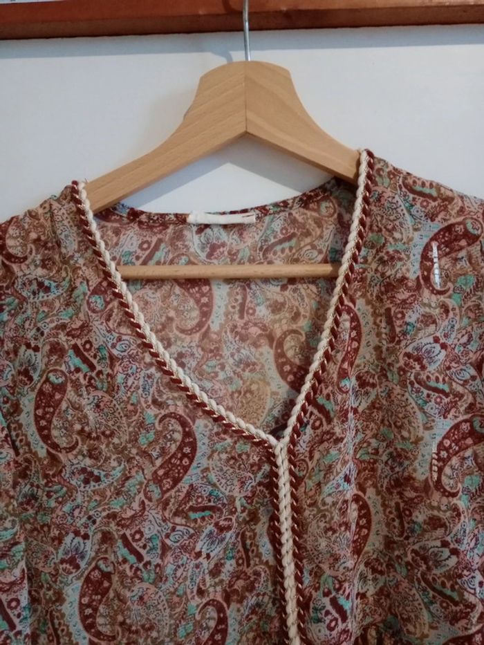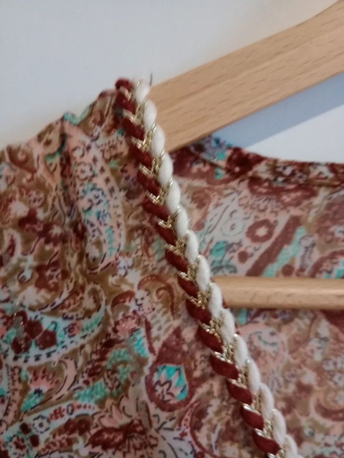 Superbe pièce, impeccablement entretenue 😍🥰 Transparente, col v avec fils dorés entrelacés dans des fils coton marrons et blancs plus épais Réparties de façon harmonieuse des petites bandes argentées sur cette blouse photos 9, 11 et dernière 😍 Manches demi Fluide et légère Plus d étiquette ni taille Aisselle à aisselle 50 cm #carineleray_femme_36