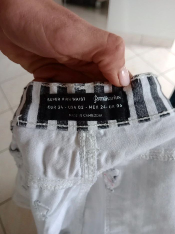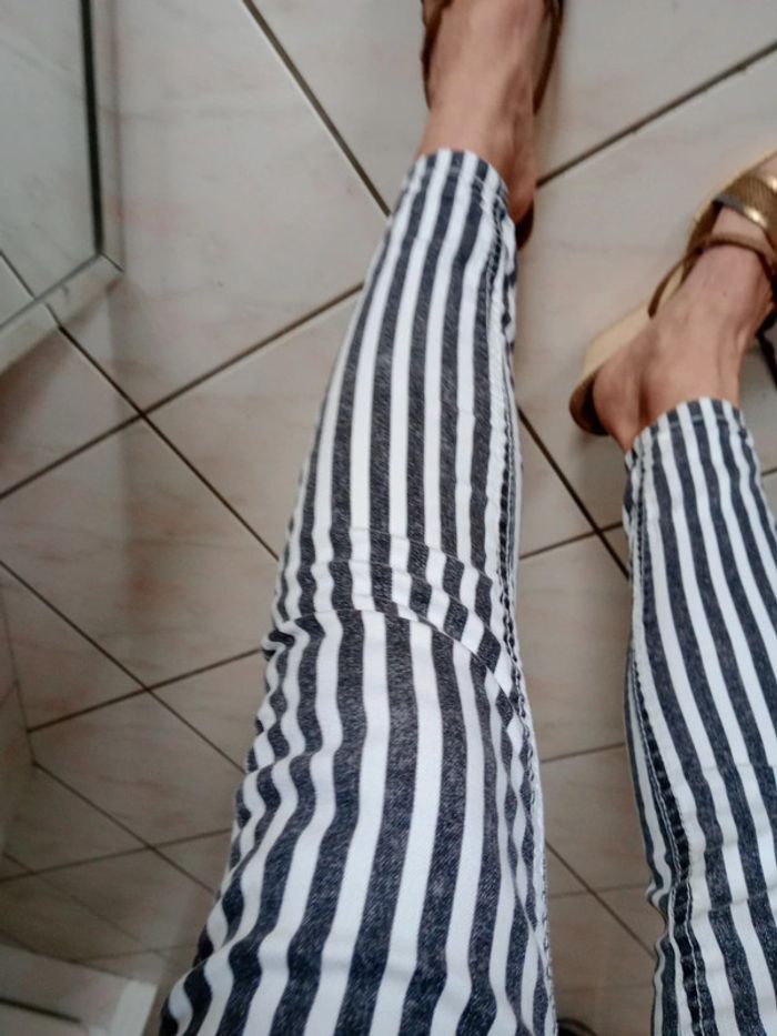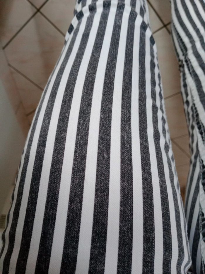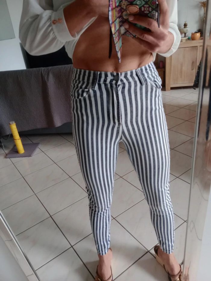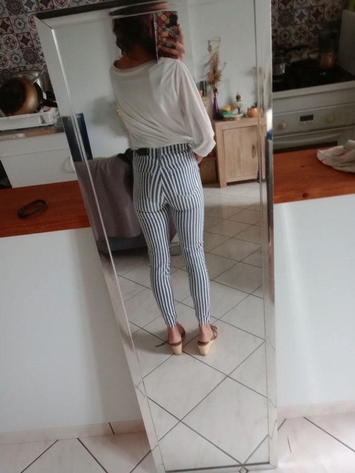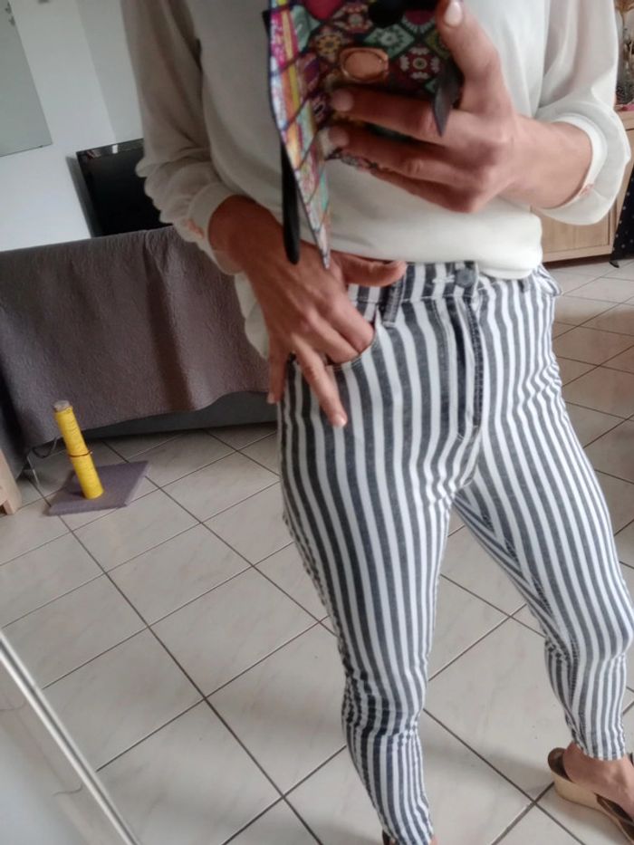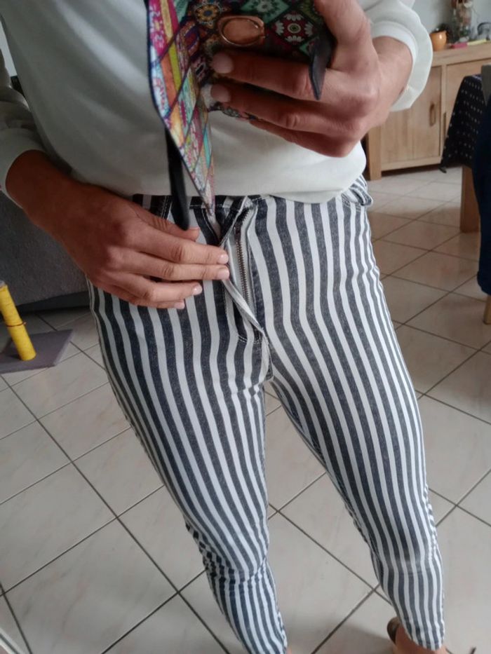 J'adore ce pantalon type Jean à rayures blanches et noires délavées 😉 Malgré le fait qu'il soit trop serré pour moi j'adore sa coupe... Plutôt taille haute, il galbe bien le corps notamment le fessier Deux poches à l'arrière, deux poches sur le côté #carineleray_femme_34