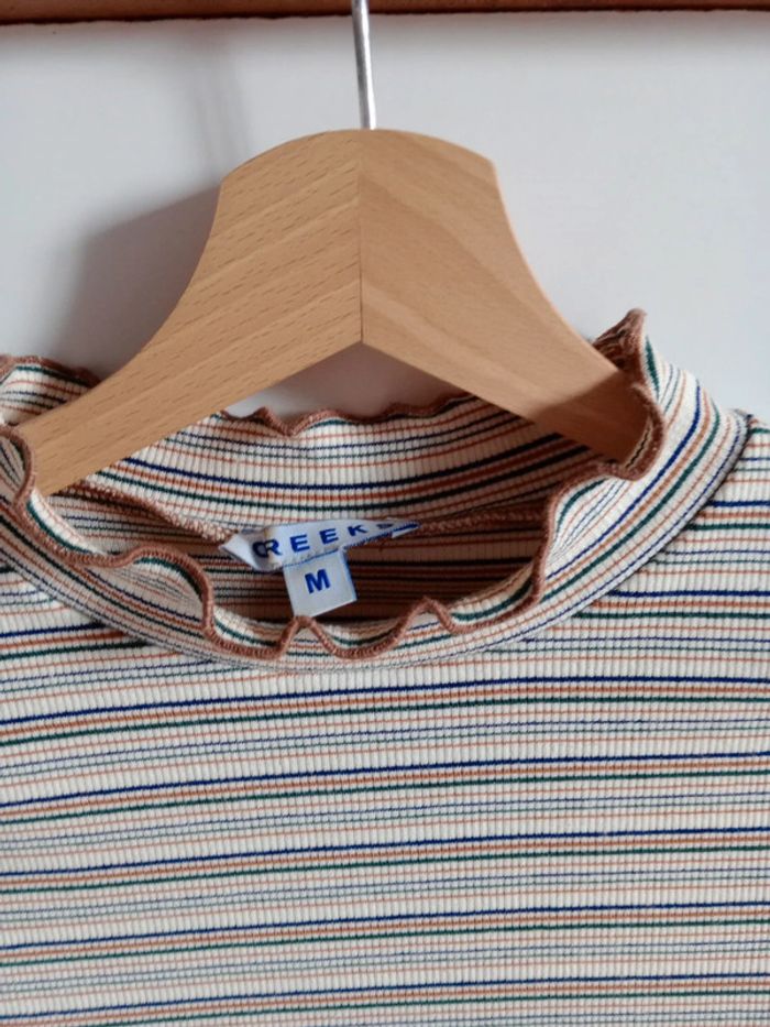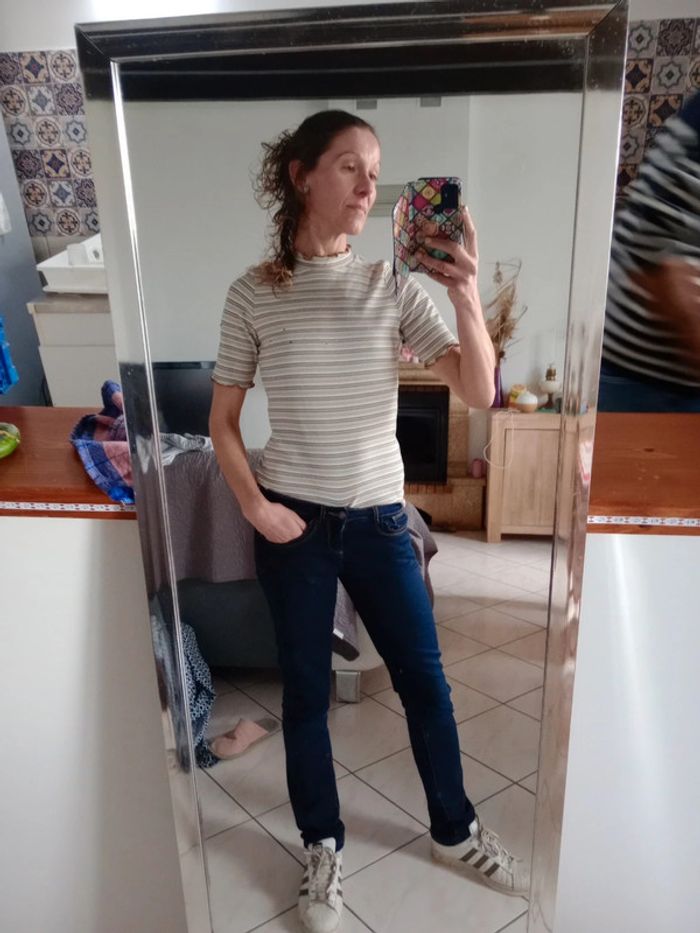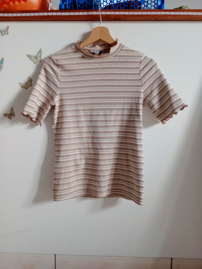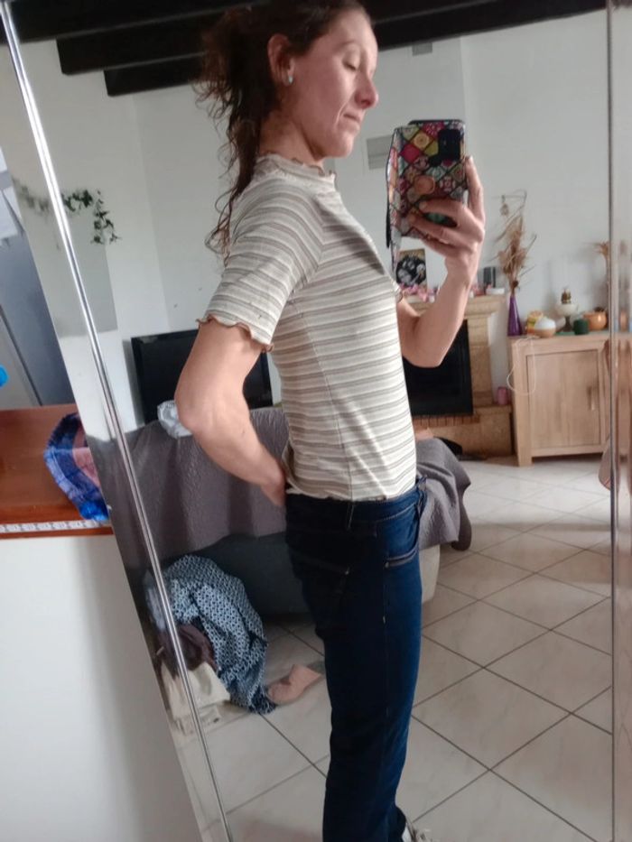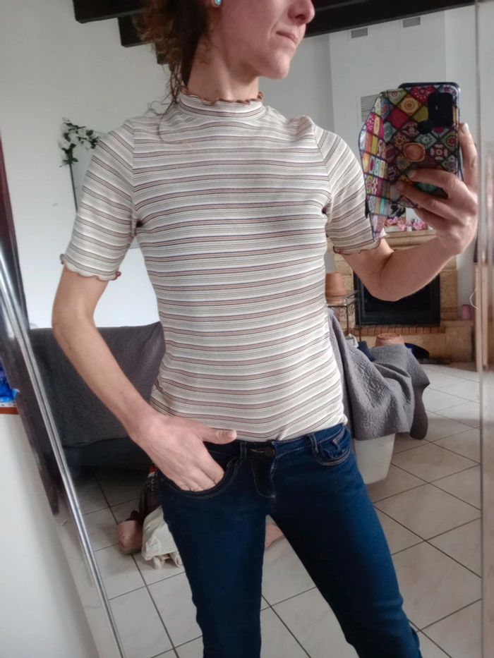 T-shirt avec petit col dont les rebords sont ondulés ainsi que le bout des manches Plus d'étiquette matière contient forcément de l'élasthanne dans la mesure où il était tirable à souhait Aisselle à aisselle 48 cm #carineleray_femme_38