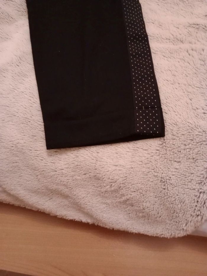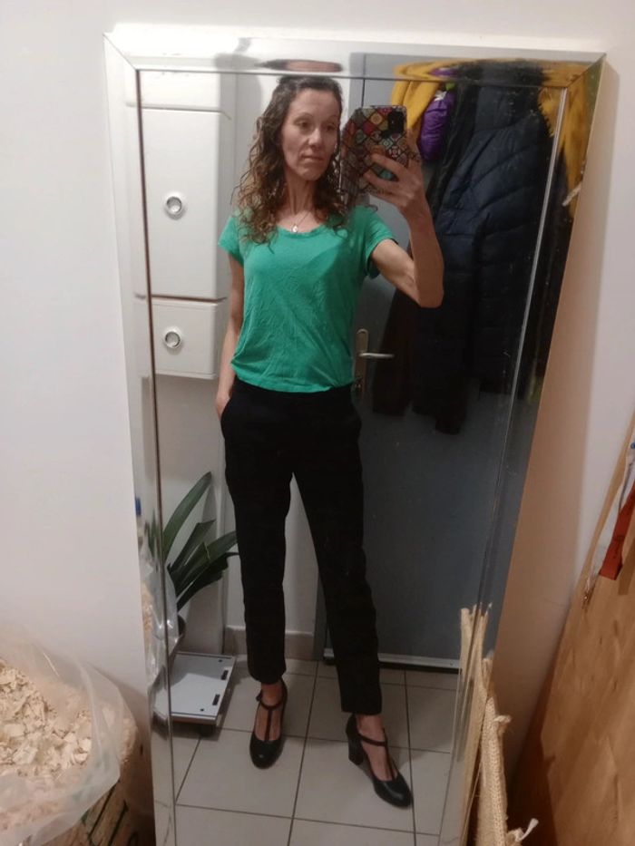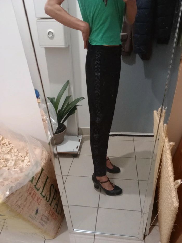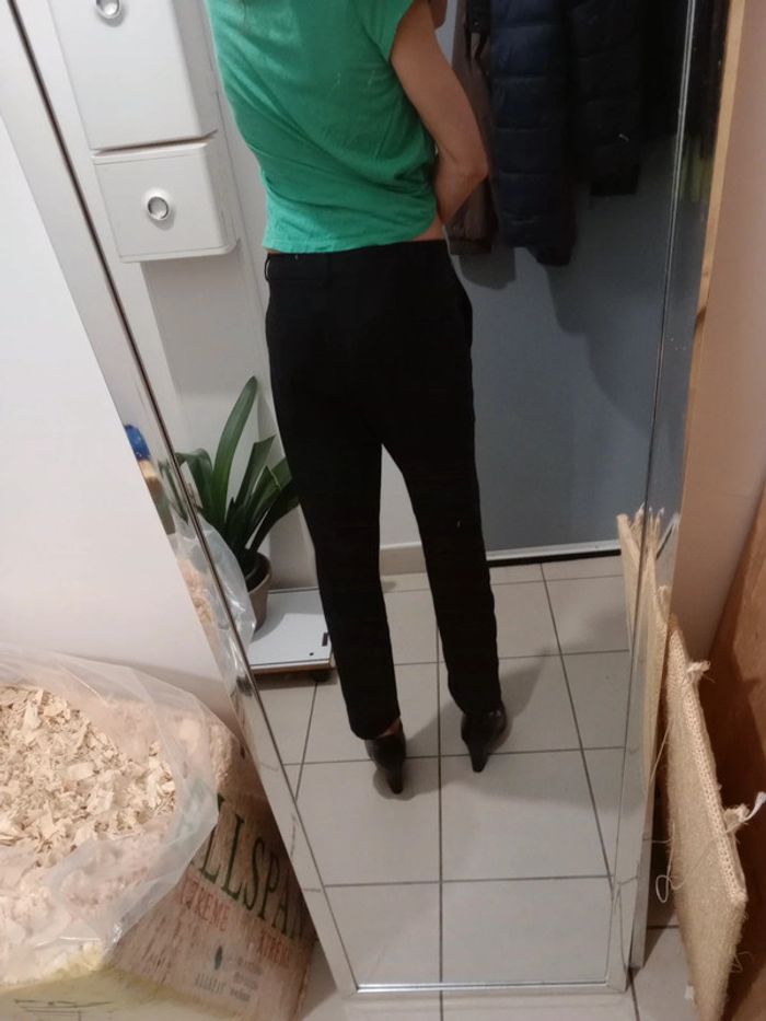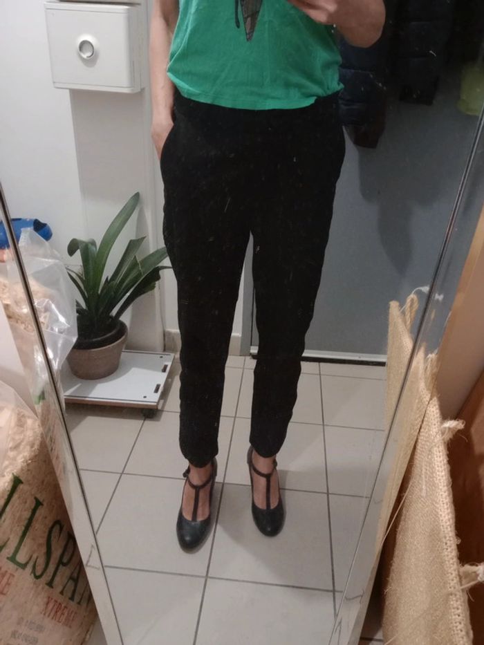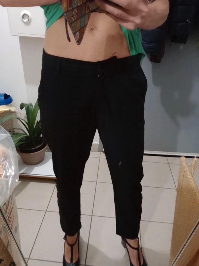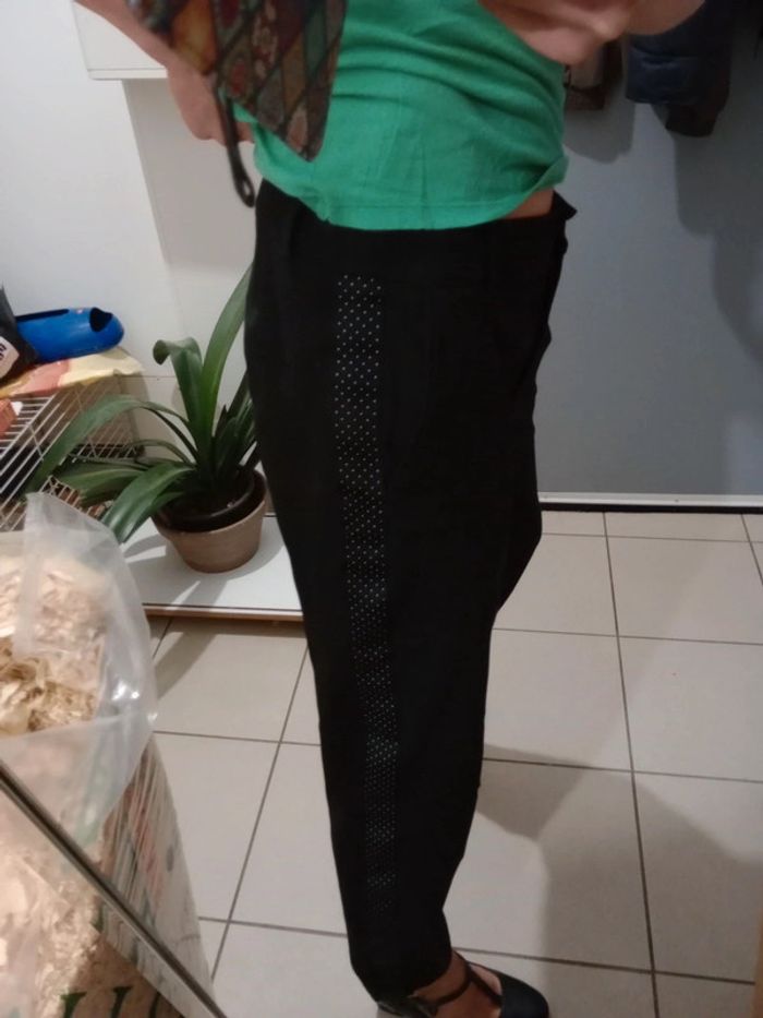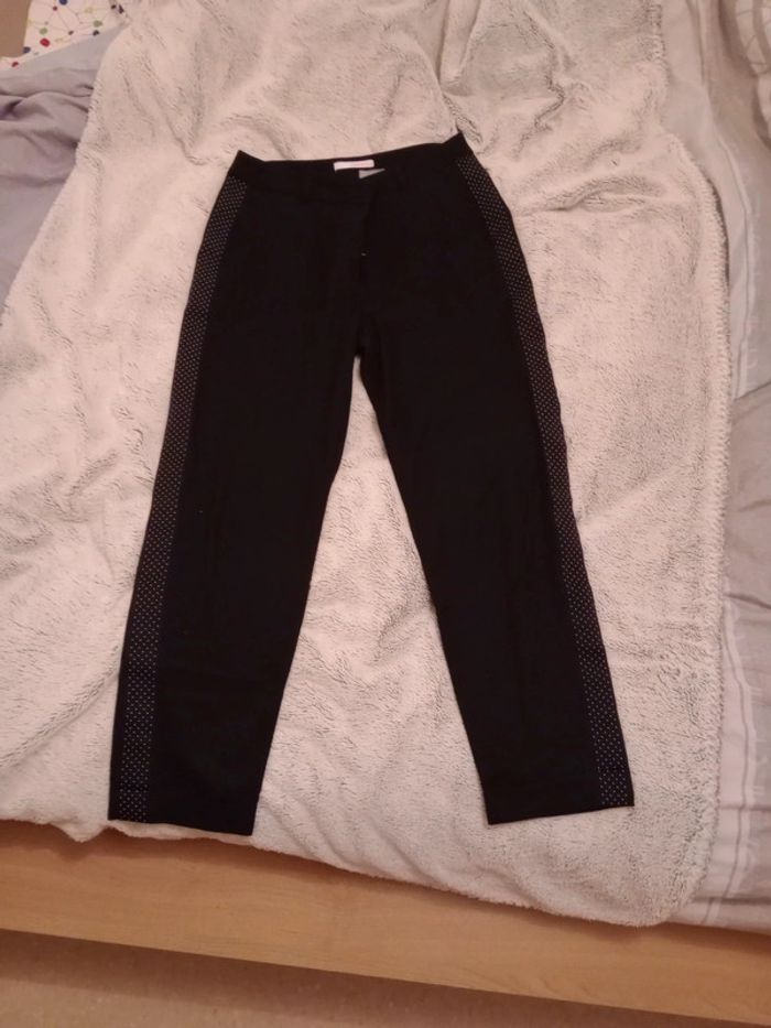 Superbe pièce... Le tissu est qualitatif Ce pantalon peut très bien être porté avec des snickers qu'avec des talons J'adore la bande sur le côté avec des petits pois blancs Deux poches sur le côté Le bas a un ourlet apparent Plus d'étiquette matière ni taille #carineleray_femme_38