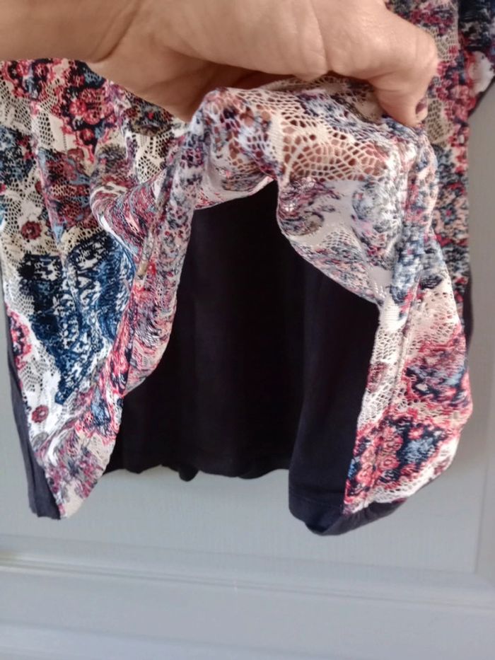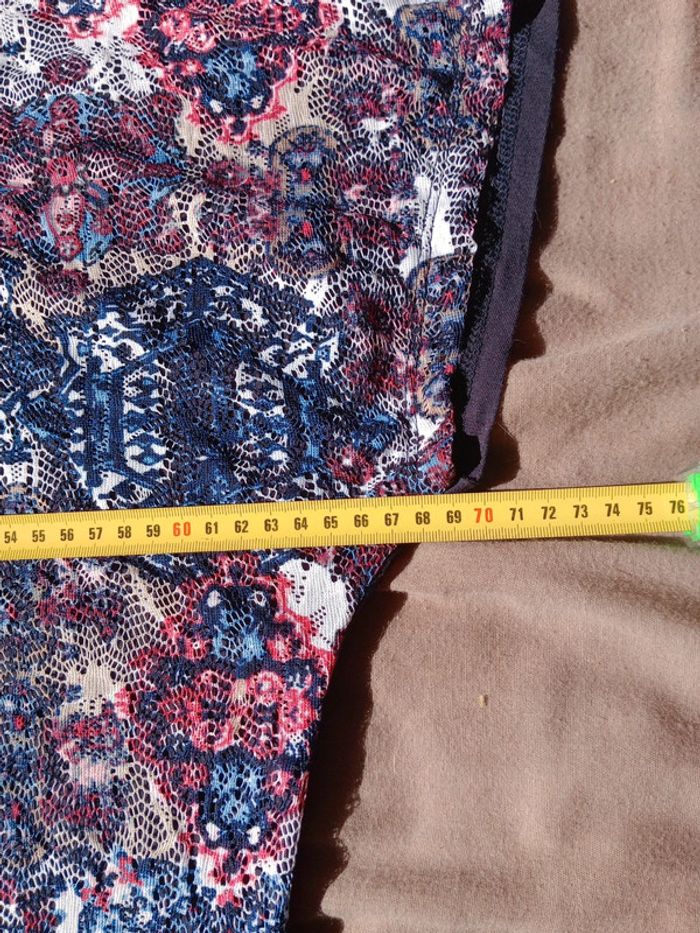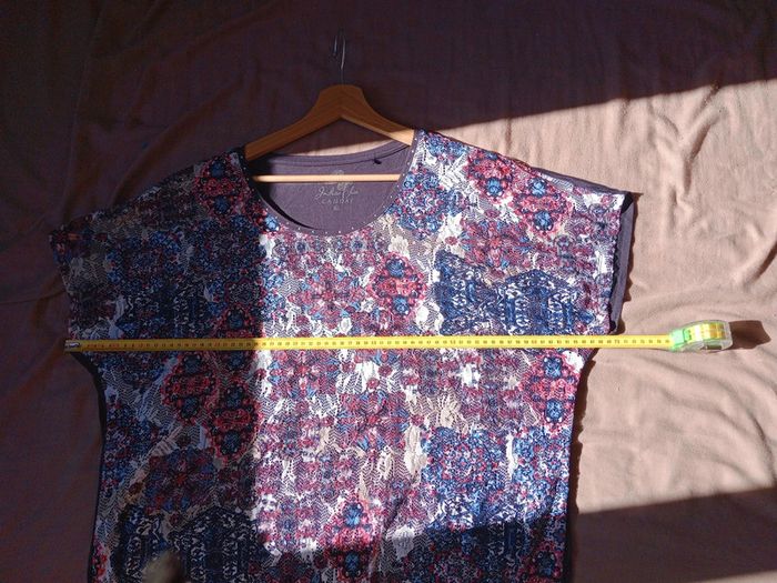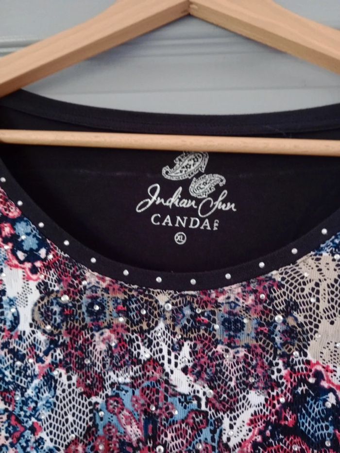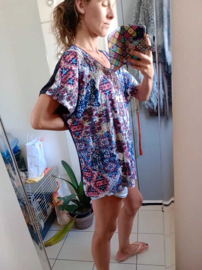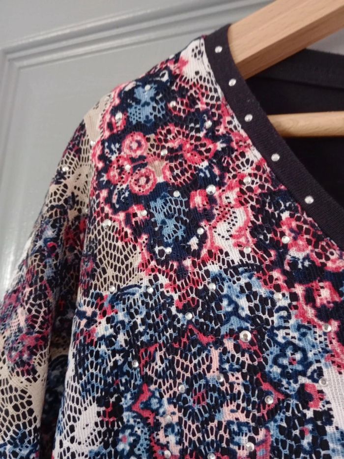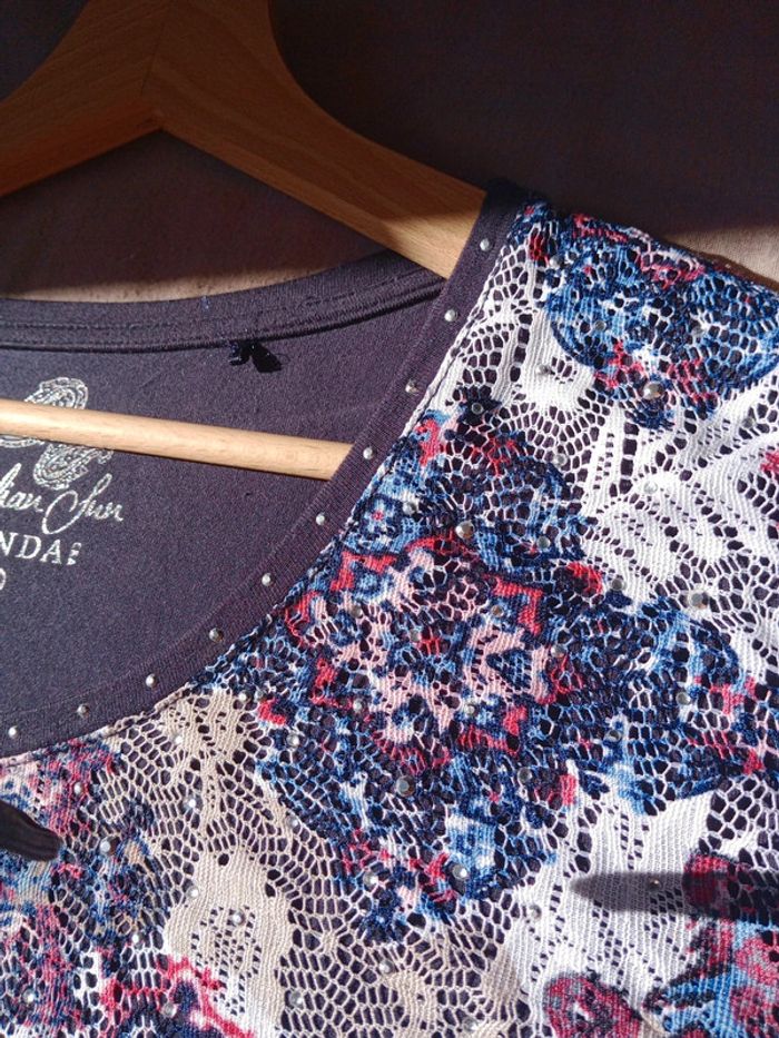 Superbe t-shirt dont le tissu est impeccable quasi neuf,doublé sur le devant car la partie fantaisie colorée est dentelée Présence de sequins un petit peu partout sur le t-shirt mais également au niveau du Col, rond #carineleray_femme_42
