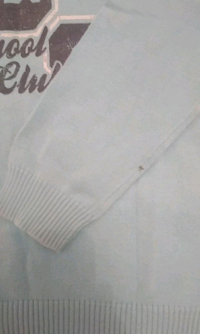 Composé de 2 pulls et 1 tee shirt manches longues. Le pull bleu a un petit trou photo 3 et 4 un point sur la manche Le tee shirt kaki : 2 petits trous cf photo 7 et 8