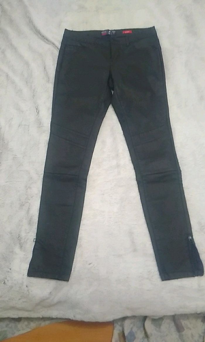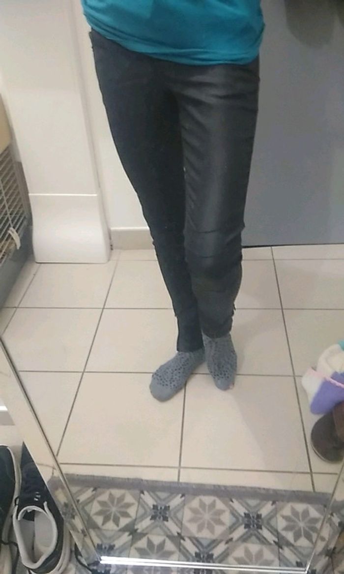 Type huilé. Micro marque photo 8 Super sympa avec les 2 petites fermetures en bas des jambes, les coutures aux genoux et poches arrières Top👍fait une superbe silhouette...trop petit pour moi Largeur de la taille 35,5 cm Longueur de l'entrejambe 28 cm Longueur du pantalon 94 cm #carineleray_femme_34