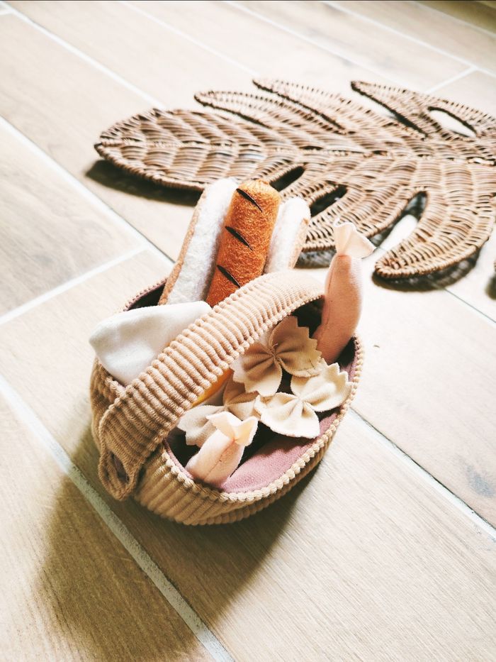 🧺 Dinette panier marron hot dog et differents ingrédients en tissu- peluche