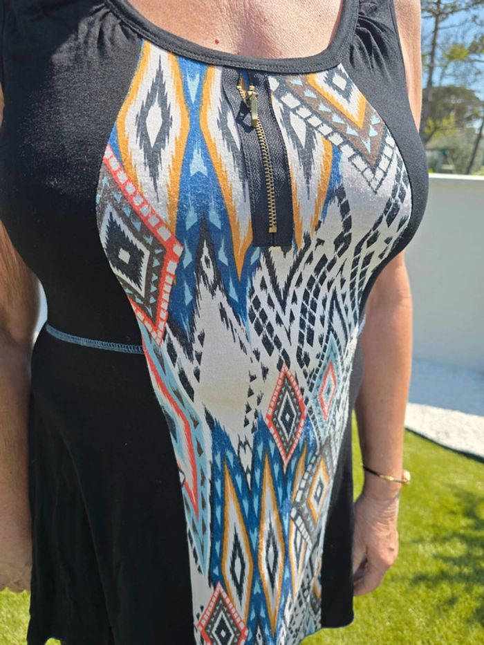 Tunique sans manches noir avec motif Taille indiquée 1 mais correspond à un 38 Marque : je ne sais plus Fabriquée en france Tres bon état #38femmebaba18bb