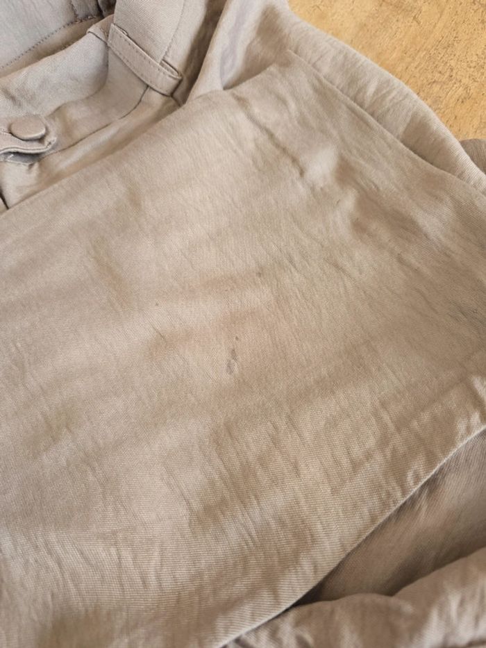 Pantalon fluide beige marron clair Passants pour ceinture fine Fermeture éclair et bouton Ourlets présents Petites tâches au bas derrière sur jambe droite Matière rayon et nylon Longueur : 90 cm Longueur entre jambes : 62 cm Largeur taille : 40 cm Taille 40 Marque un jour ailleurs #40femmebaba18bb