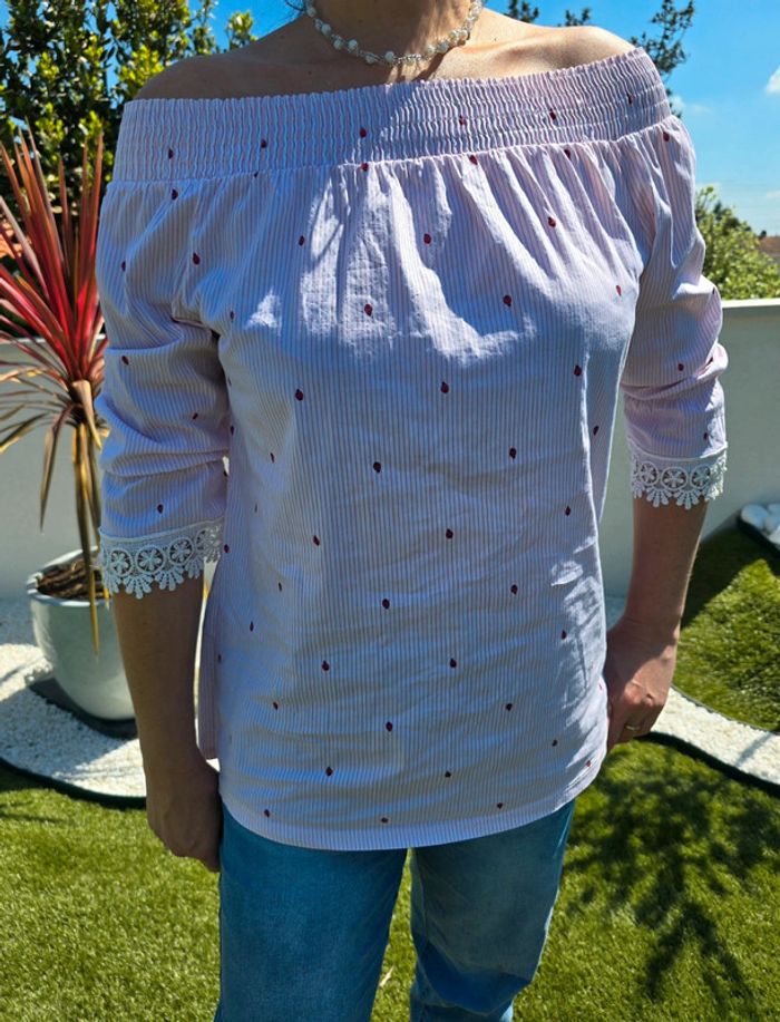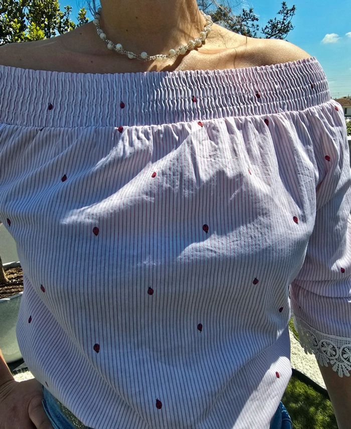 Top épaules dénudées rose à rayures et motifs coccinelles 🐞 Dentelles aux bas des manches Matière coton, nylon et elasthane Taille 38 Marque : je ne sais plus Tres bon état #38femmebaba18bb