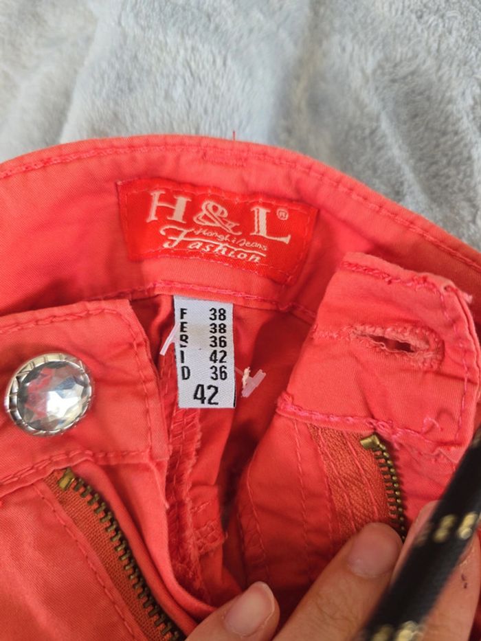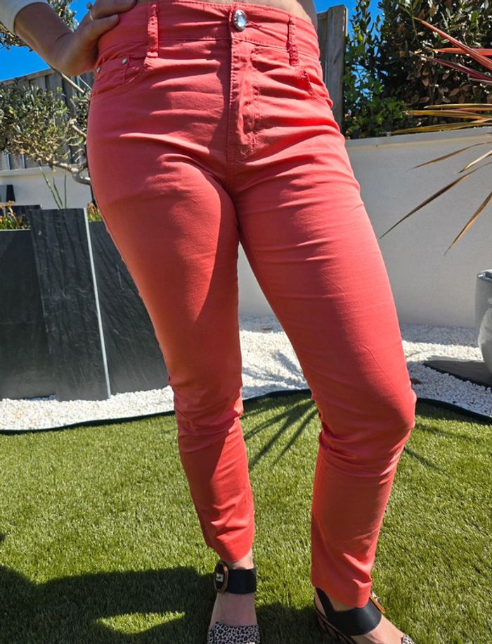 Pantalon couleur corail Matière stretch Ourlet present Longueur : 95 Longueur entre jambe : 70 cm Bouton style diamant Strass aux niveaux des poches Taille 38 Marque : H&L Très bon état #38femmebaba18bb