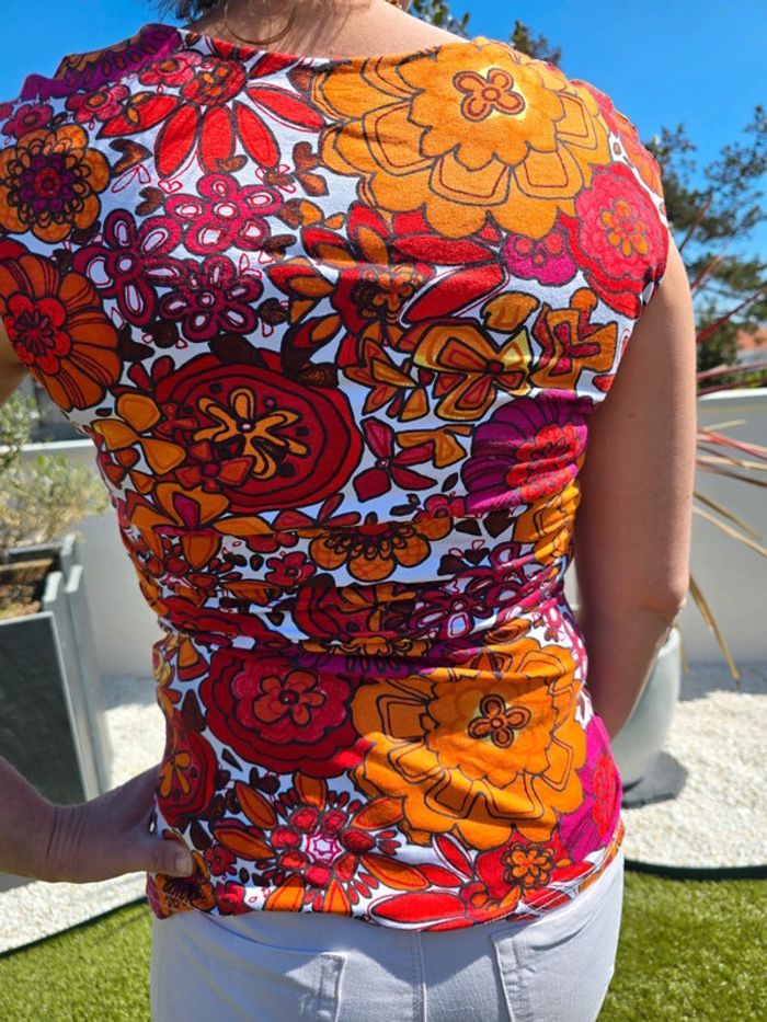 Débardeur fleuri orangé rouge Décolletée en V Taille indiquée 3 mais correspond à un 38 Marque patrice breal Très bon état #38femmebaba18bb
