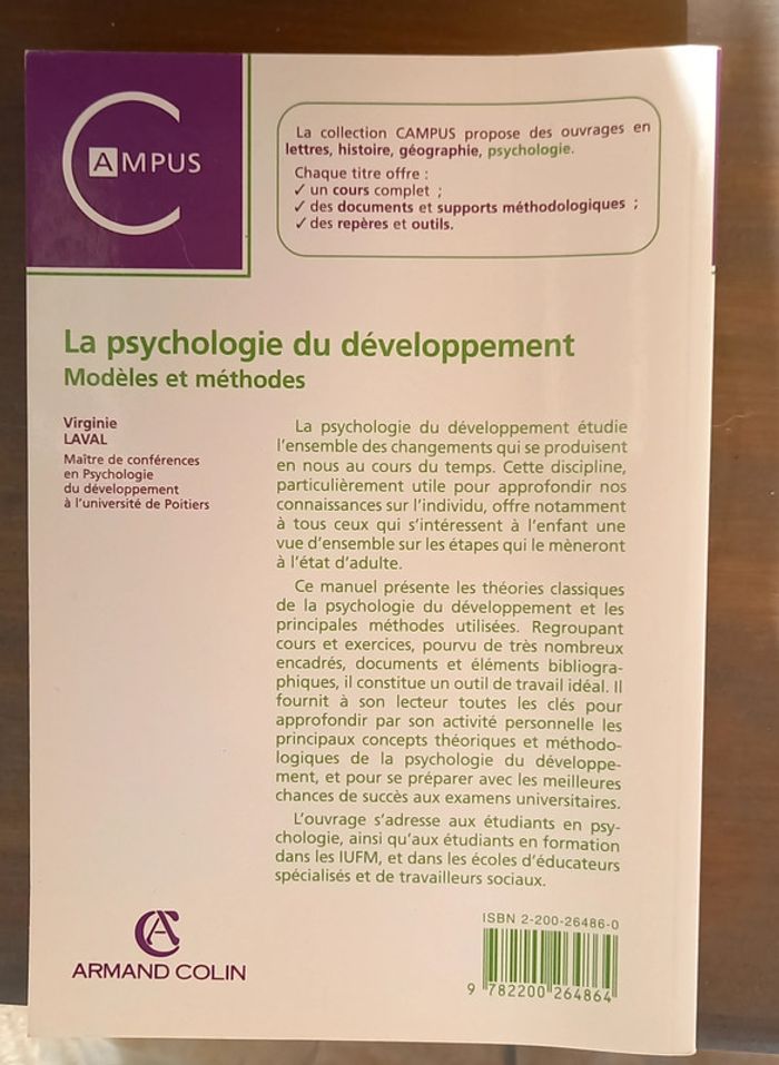 La psychologie du développement étudie l'ensemble des changements qui se produisent en nous au cours du temps. Cette discipline, particulièrement utile pour approfondir nos connaissances sur l'individu, offre notamment à tous ceux qui s'intéressent à l'enfant une vue d'ensemble sur les étapes qui le mèneront à l'état d'adulte. Ce manuel présente les théories classiques de la psychologie du développement et les principales méthodes utilisées. Regroupant cours et exercices, pourvu de très nombreux encadrés, documents et éléments bibliographiques, il constitue un outil de travail idéal. Il fournit à son lecteur toutes les clés pour approfondir par son activité personnelle les principaux concepts théoriques et méthodologiques de la psychologie du développement, et pour se préparer avec les meilleures chances de succès aux examens universitaires. L'ouvrage s'adresse aux étudiants en psychologie, ainsi qu'aux étudiants en formation dans les IUFM, et dans les écoles d'éducateurs spécialisés et de travailleurs sociaux.