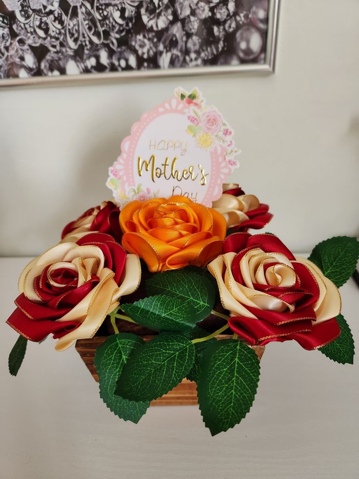 Composition rose en ruban de satin cadeau fête des mères Le pot contient un bijou en acier inoxydable ainsi qu un mini parfum
