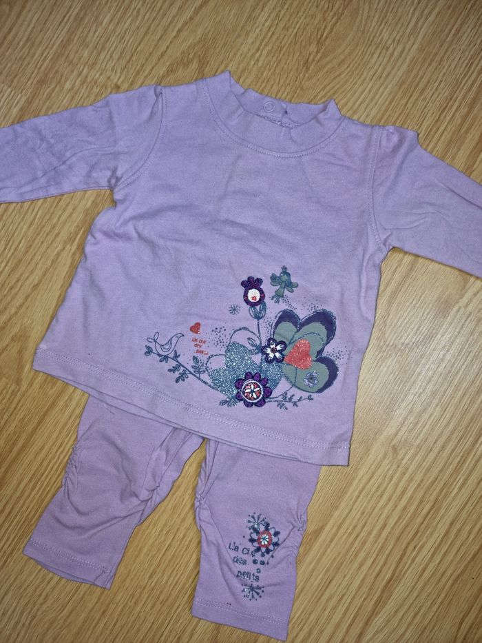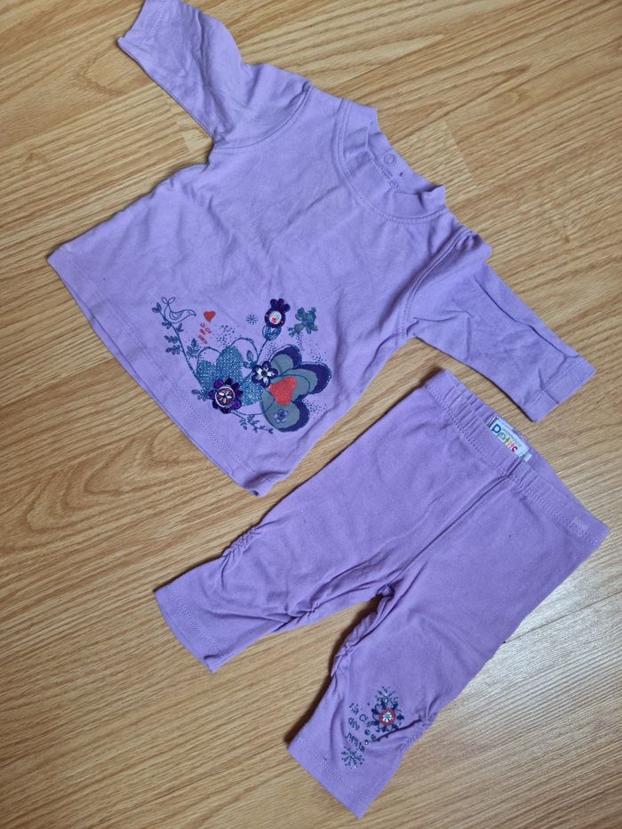 Bonjour, je vends cet ensemble violet clair avec imprimé. Legging et maillot à manches longues. Taille 3mois. En bon état