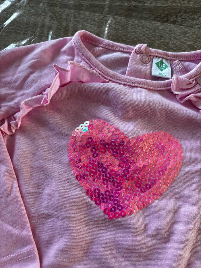 Tee shirt rose TEX taille 12 mois Motif cœur en sequins, 3 pressions dans le dos TRÈS BON ÉTAT #bébéfille #bebe12mois #printemps #été Retrouvez tous mes articles bébé 12 mois : #IxFeelxInsanebebe12mois