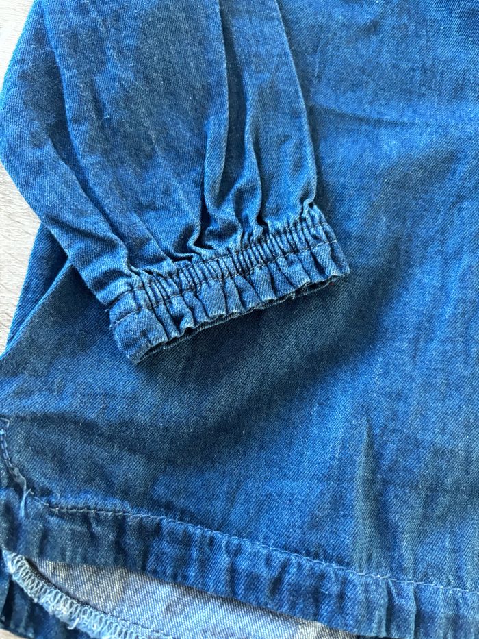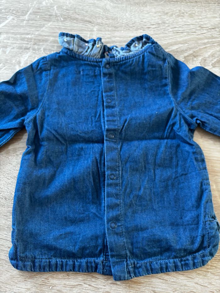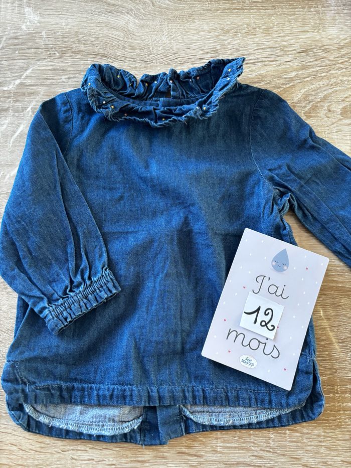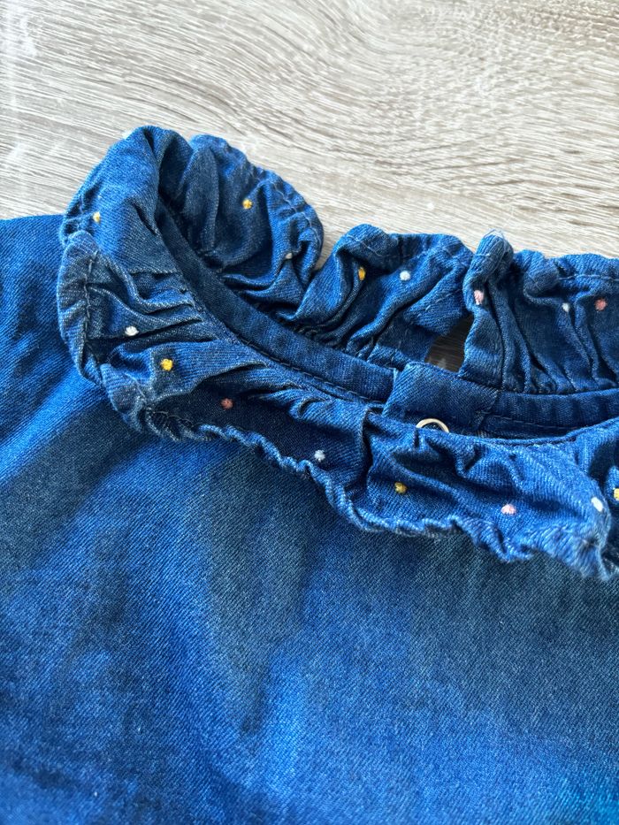 Blouse en jean KIABI taille 12 mois motifs pois sur le col a volants, pressions dans le dos, élastique aux poignets TRÈS BON ÉTAT #bébéfille #bebe12mois #printemps #été Retrouvez tous mes articles bébé 12 mois : #ixfeelxinsanebebe12mois