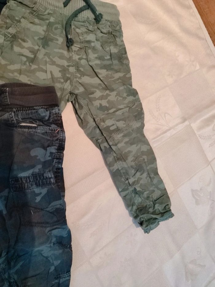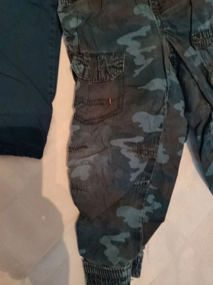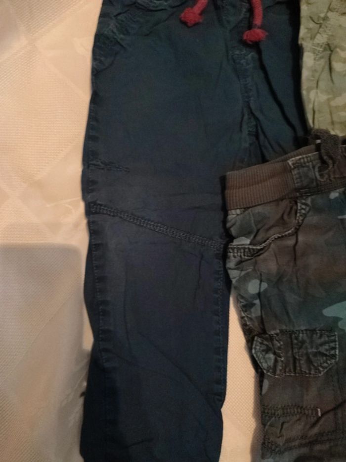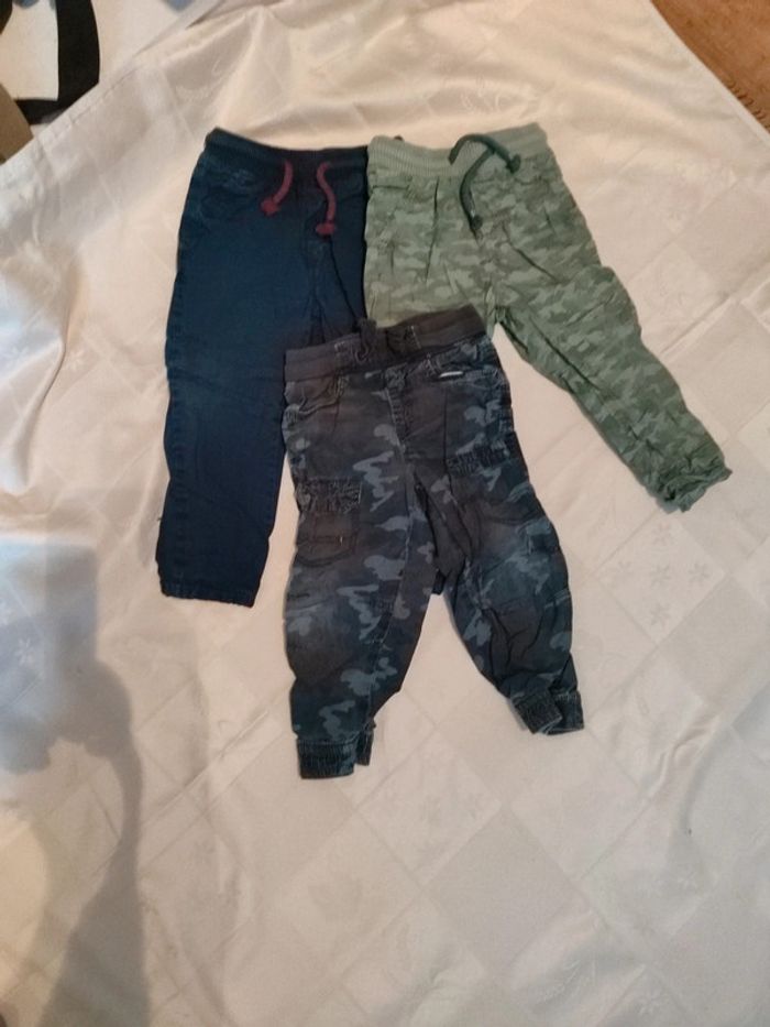 Lot de trois pantalons doubles Souvent porté Bon état Genoux Légèrement usé pour le bleu motif kaki Taille 24 mois 86-92 cm