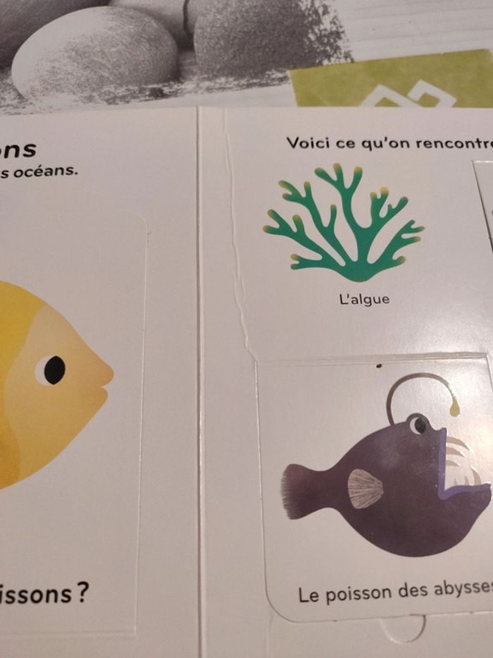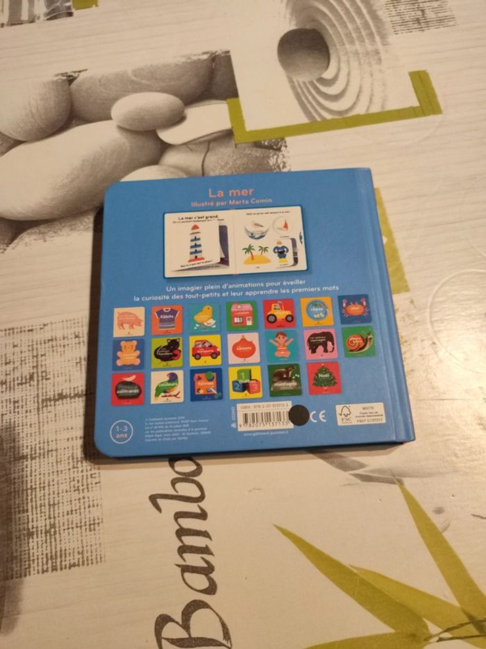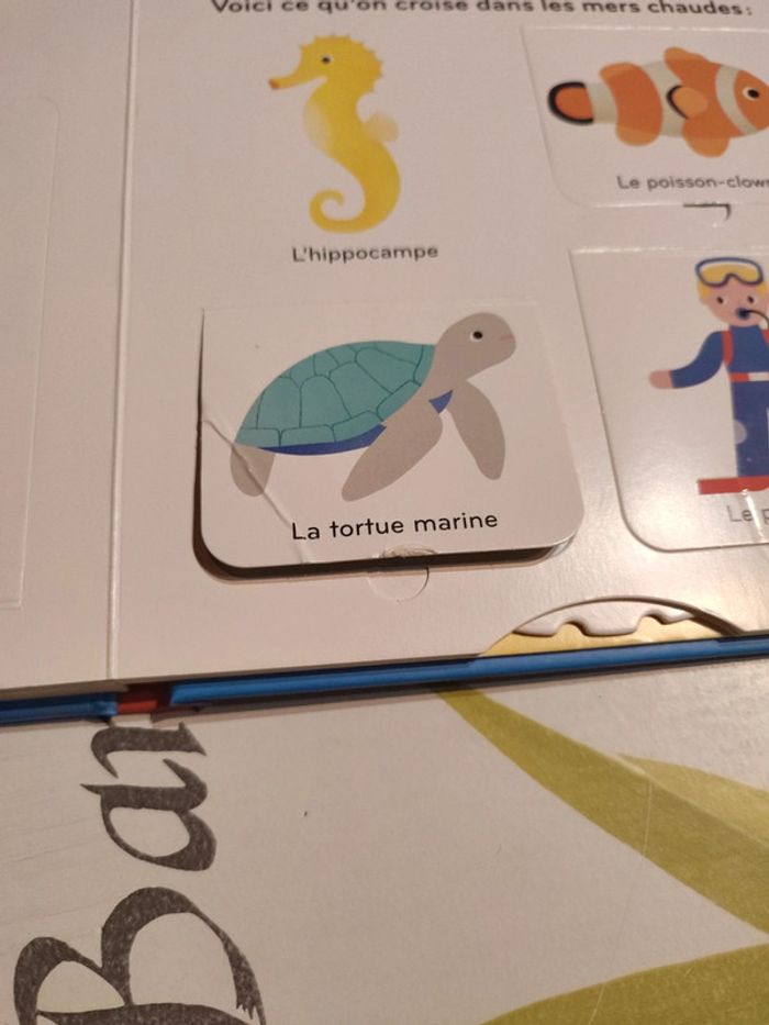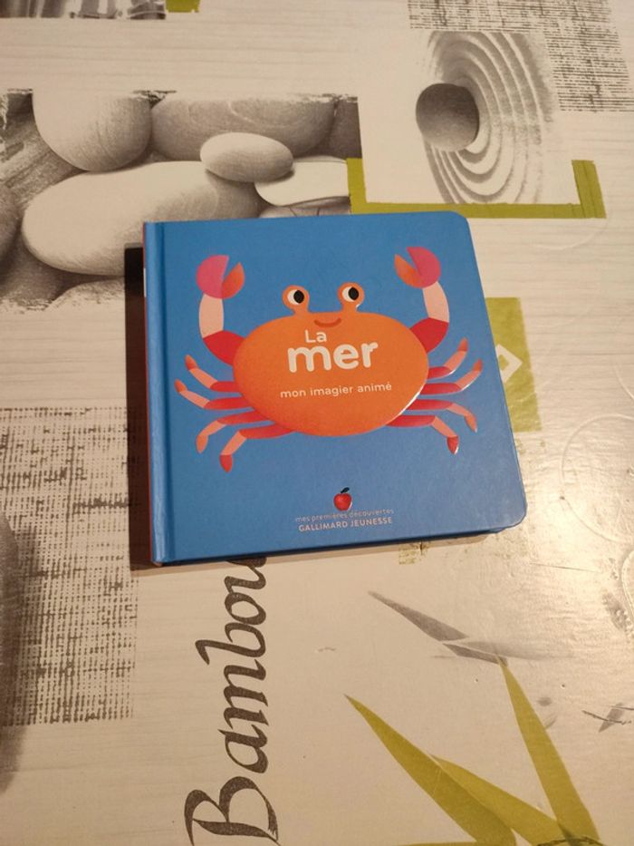 Livre cartonné La mer Des volets à soulever, roue à tourner Légèrement abîmé voir photo mais n'empêche pas la découverte du monde marin a travers le livre