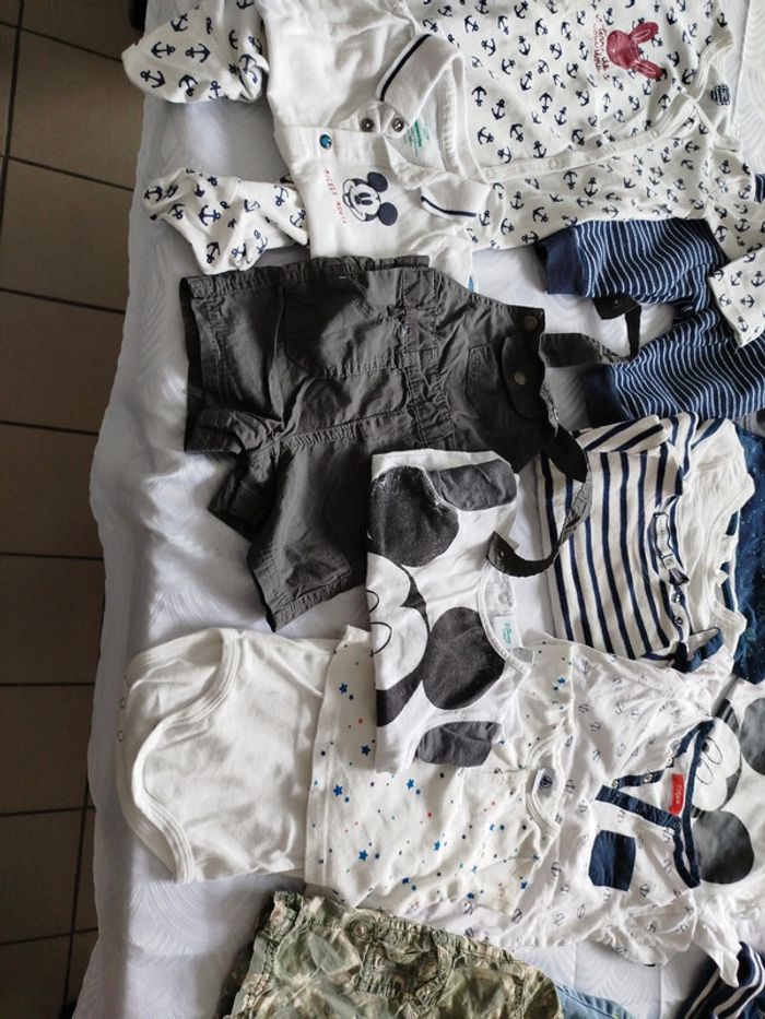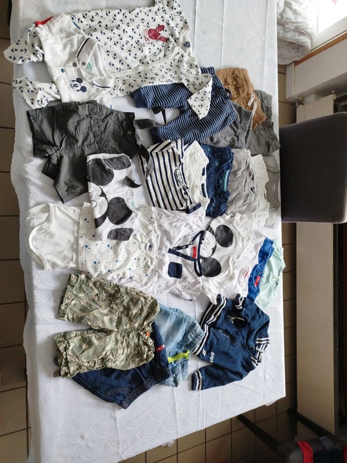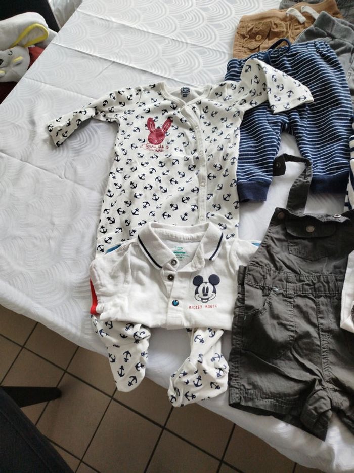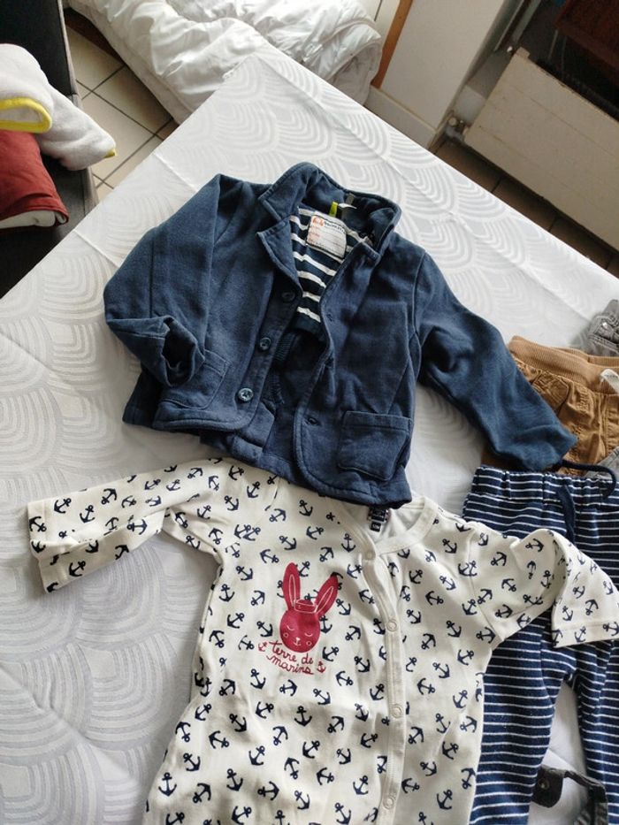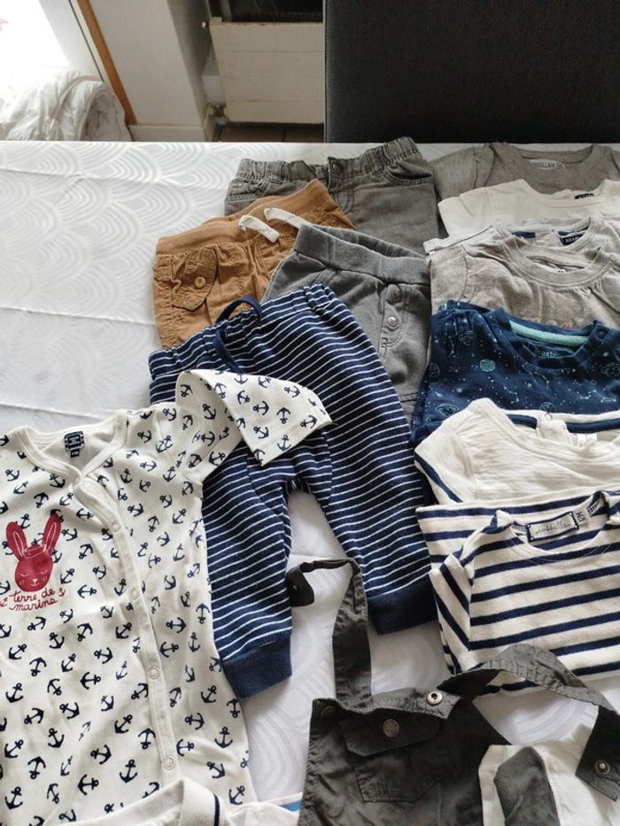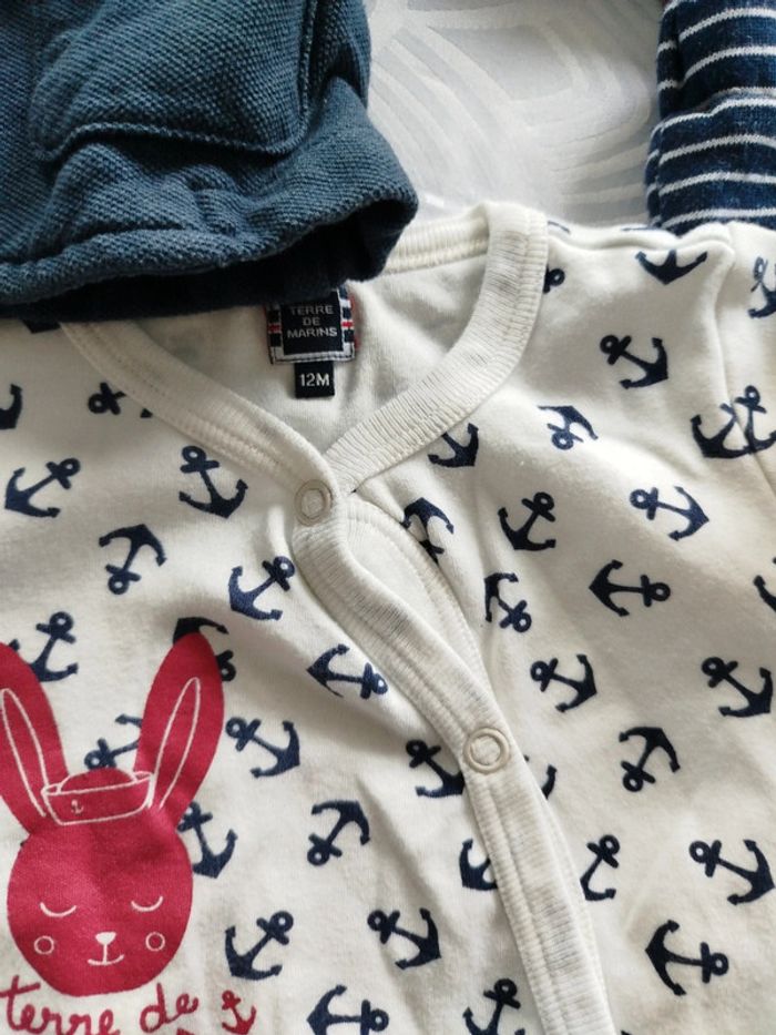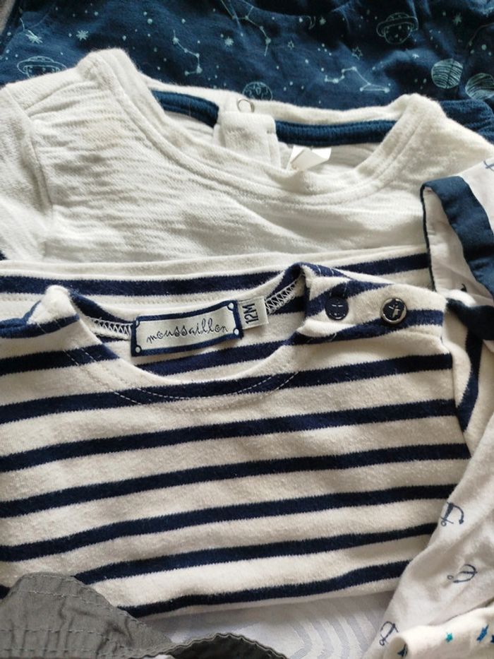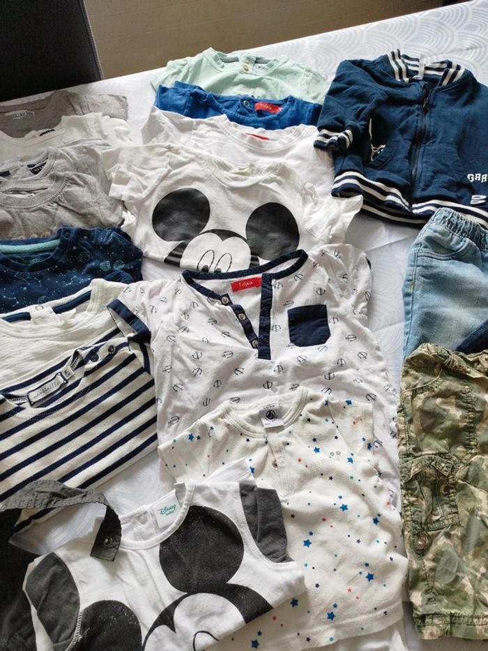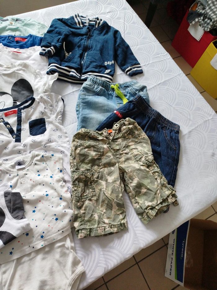 Lot de vêtements taille 1 an 6 tee shirt ml 4 tee shirt mc 3 bermudas 4 pantalons Une salopette été 2 pulls légers 1 pyjama 2 bodies mc 1 gilet zippé Une veste