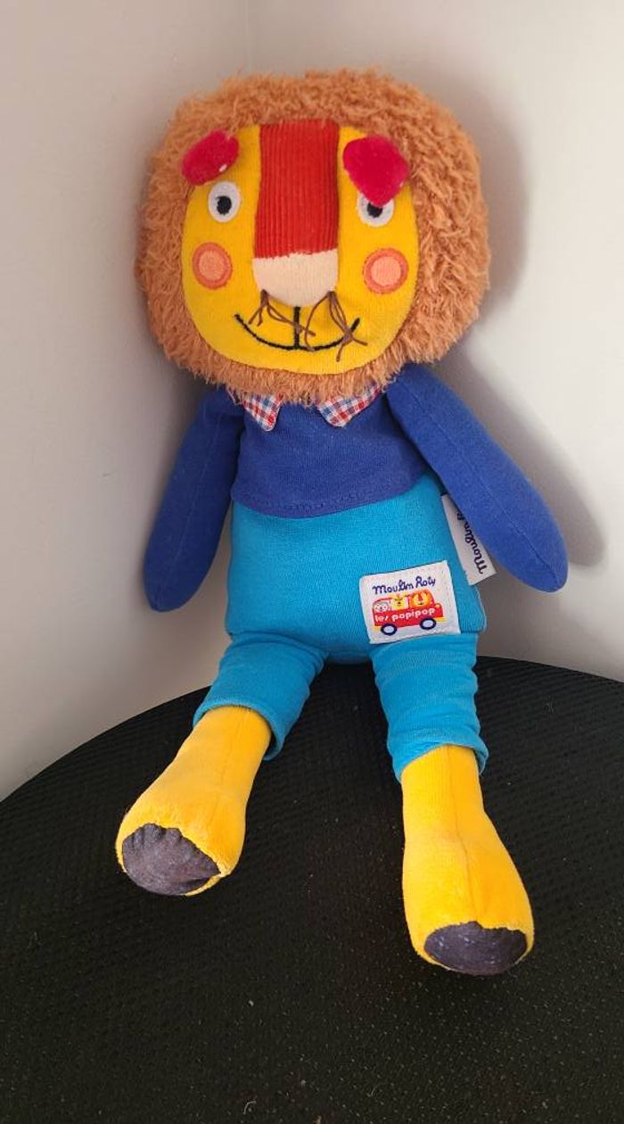 Doudou Peluche Lion marron orange bleu rouge 32cm Les Popipop Moulin Roty