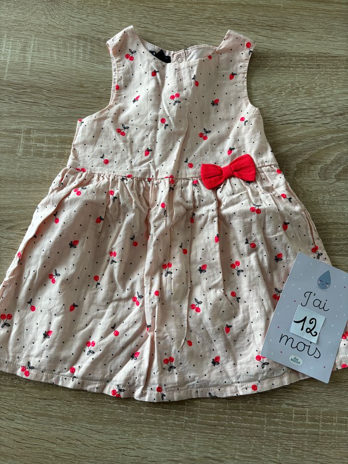 Robe rose KIABI taille 12 mois motifs cerises et pois, pressions dans le dos, noeud sur le devant TRÈS BON ÉTAT #bébéfille #bebe12mois #printemps #été Retrouvez tous mes articles bébé 12 mois : #ixfeelxinsanebebe12mois