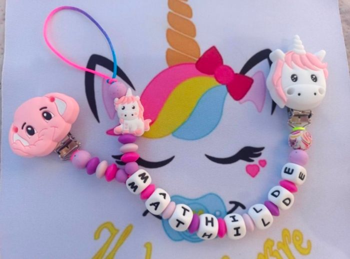 Une Attache Licorne doudou pour ne plus perdre le doudou avec deux clips pour accrocher aux tissus sans les abîmer, un pour le vêtement, l'autre au doudou avec une dérivation pour accrocher la tétine. Respect des normes CE, composée de perles silicone alimentaire et/ou bois naturel. 100% personnalisable, énormément de choix de clips, perles, etc… Envoyez-moi un message afin de créer main dans la main votre accessoire idéal. Une photo du prototype de celui-ci vous est envoyé pour validation avant envoi.