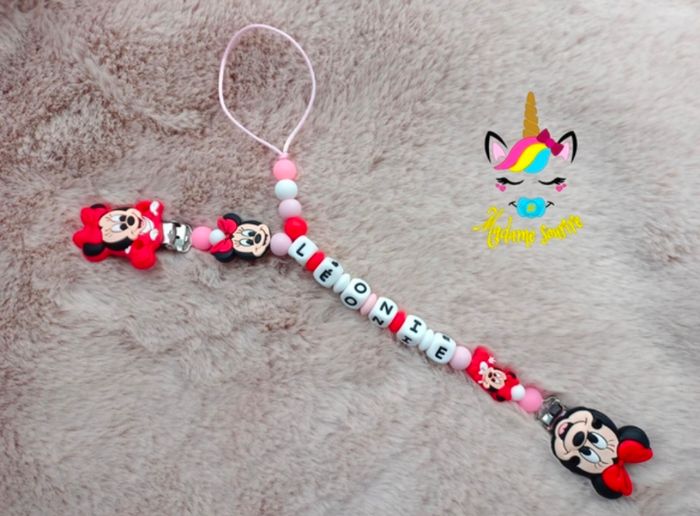 Une Attache Minnie doudou pour ne plus perdre le doudou avec deux clips pour accrocher aux tissus sans les abîmer, un pour le vêtement, l'autre au doudou avec une dérivation pour accrocher la tétine. Respect des normes CE, composée de perles silicone alimentaire et/ou bois naturel. 100% personnalisable, énormément de choix de clips, perles, etc… Envoyez-moi un message afin de créer main dans la main votre accessoire idéal. Une photo du prototype de celui-ci vous est envoyé pour validation avant envoi.