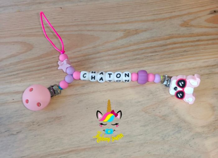 Une Attache Étoile nouée doudou pour ne plus perdre le doudou avec deux clips pour accrocher aux tissus sans les abîmer, un pour le vêtement, l'autre au doudou avec une dérivation pour accrocher la tétine. Respect des normes CE, composée de perles silicone alimentaire et/ou bois naturel. 100% personnalisable, énormément de choix de clips, perles, etc… Envoyez-moi un message afin de créer main dans la main votre accessoire idéal. Une photo du prototype de celui-ci vous est envoyé pour validation avant envoi.