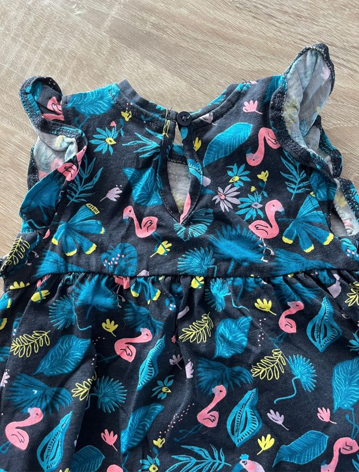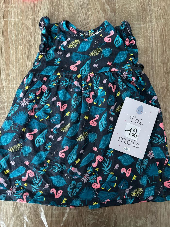 robe bleue GÉMO taille 12 mois Motif flamands rose/feuilles, volants sur les manches, s’attache dans le dos à l’aide d’un petit bouton TRES BON ÉTAT #bébéfille #bebe12mois #printemps #été Retrouvez tous mes articles bébé 12 mois : #ixfeelxinsanebebe12mois